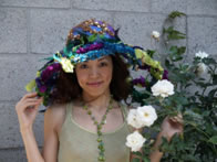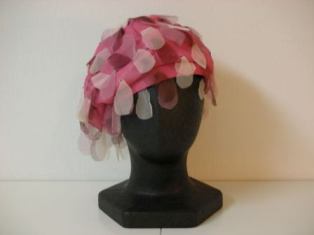 | ヒイロ | ┃たとえば、これなんかはギャザーを入れて、六枚の三角の布を縫って合わせて形にしていったんです。 →写真<ピンクひらひらシリーズ帽子> |