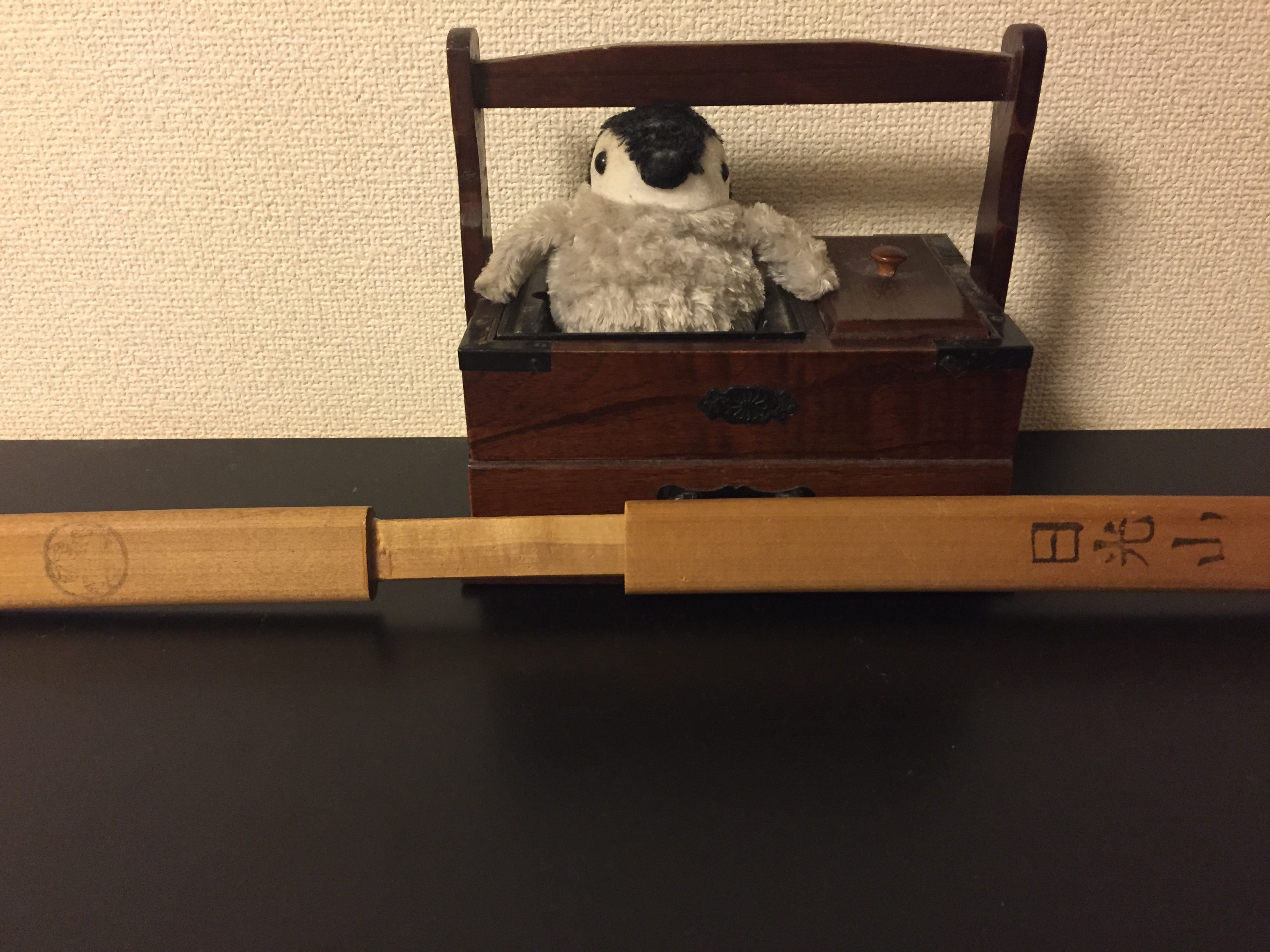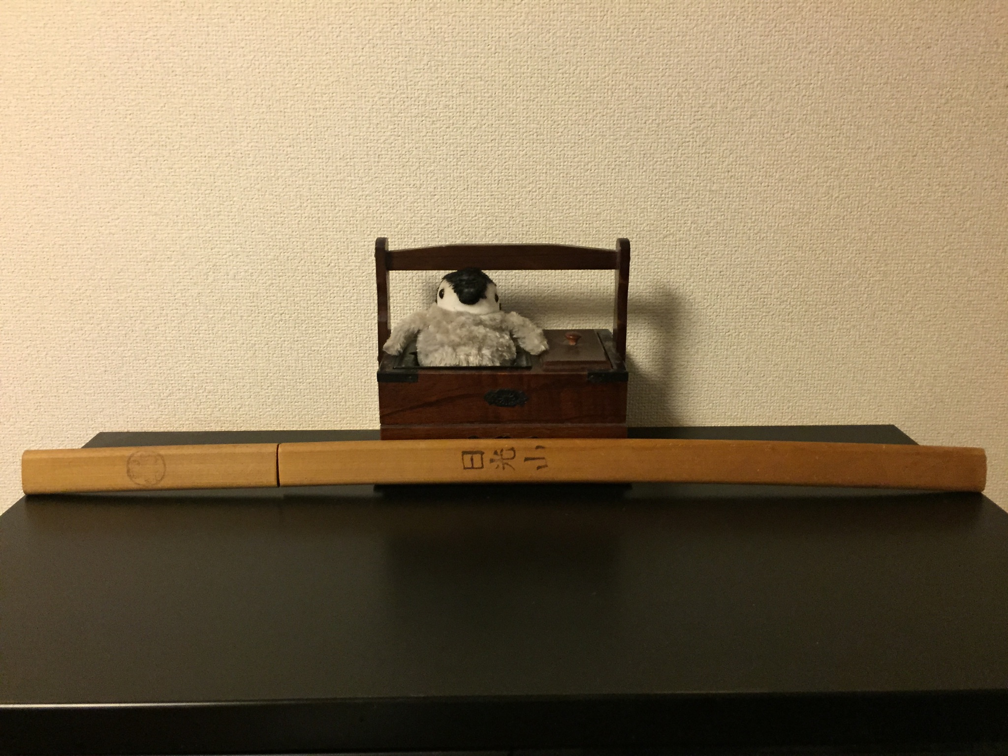 葵の御紋が入ってます。たぶん、東照宮で調子に乗って買ってしまったんだと思います(笑)きっとバスの中で笑かしにかかってたんだと思います。撮影や舞台で使う刀よりは遥かに短いです。