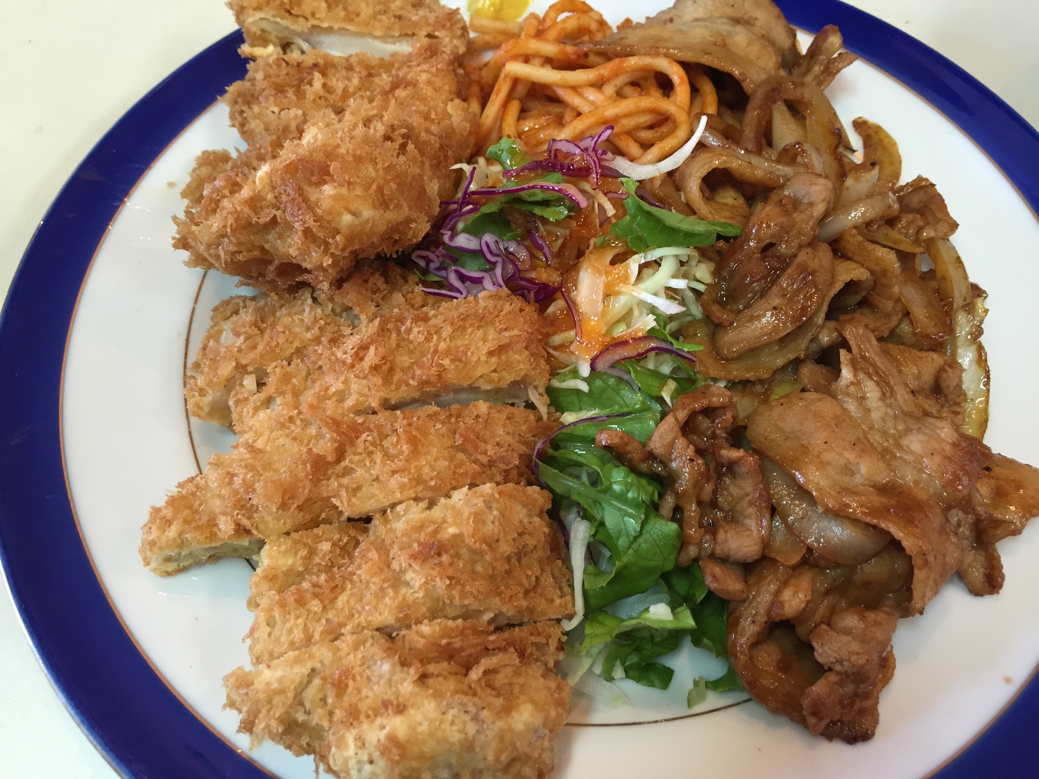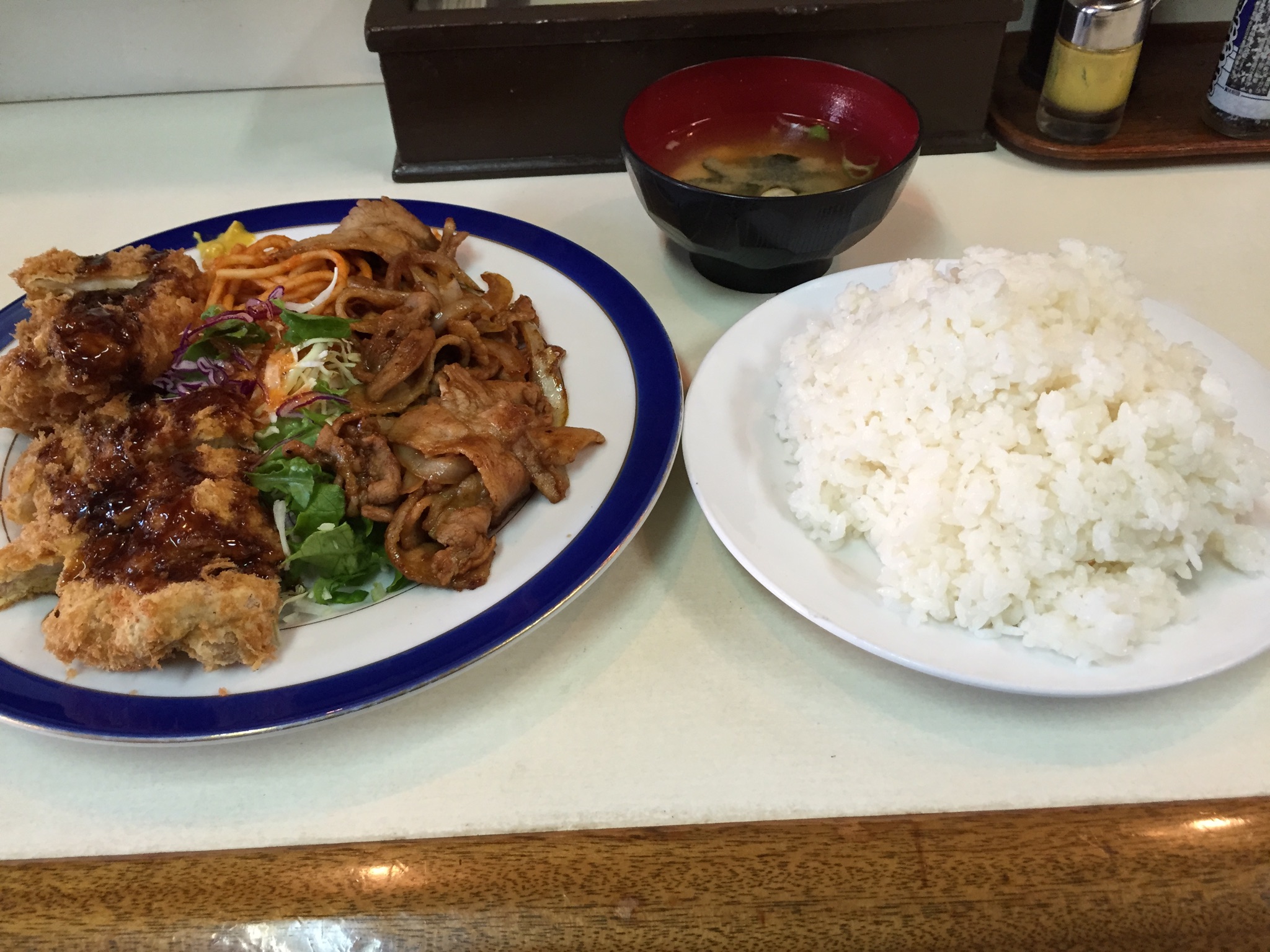 いやあ。旨い!甘辛の焼肉とサクサクのチキンカツでご飯バクバク進むのね。