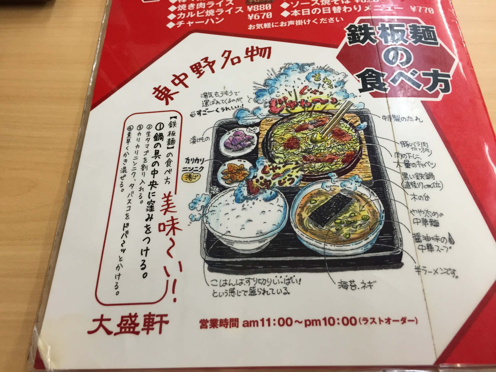 東中野名物鉄板麺880円をチョイス。もうね。絵を見てるだけで旨そう(笑)