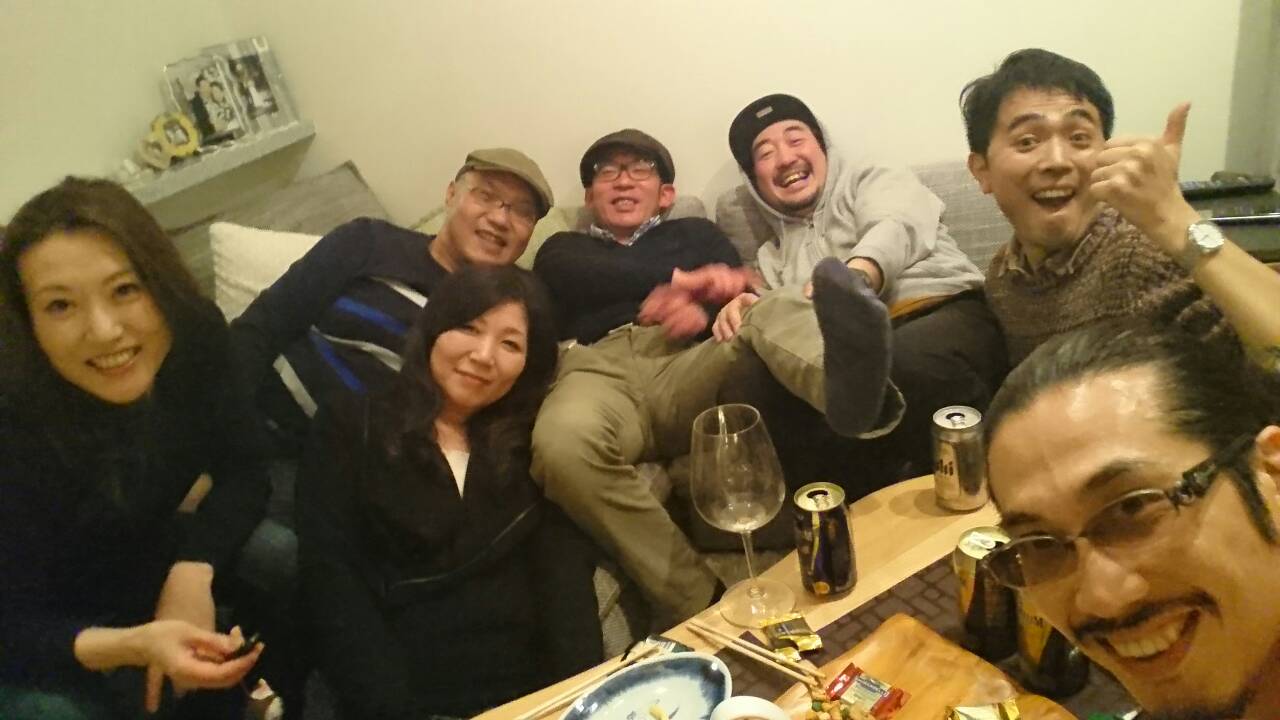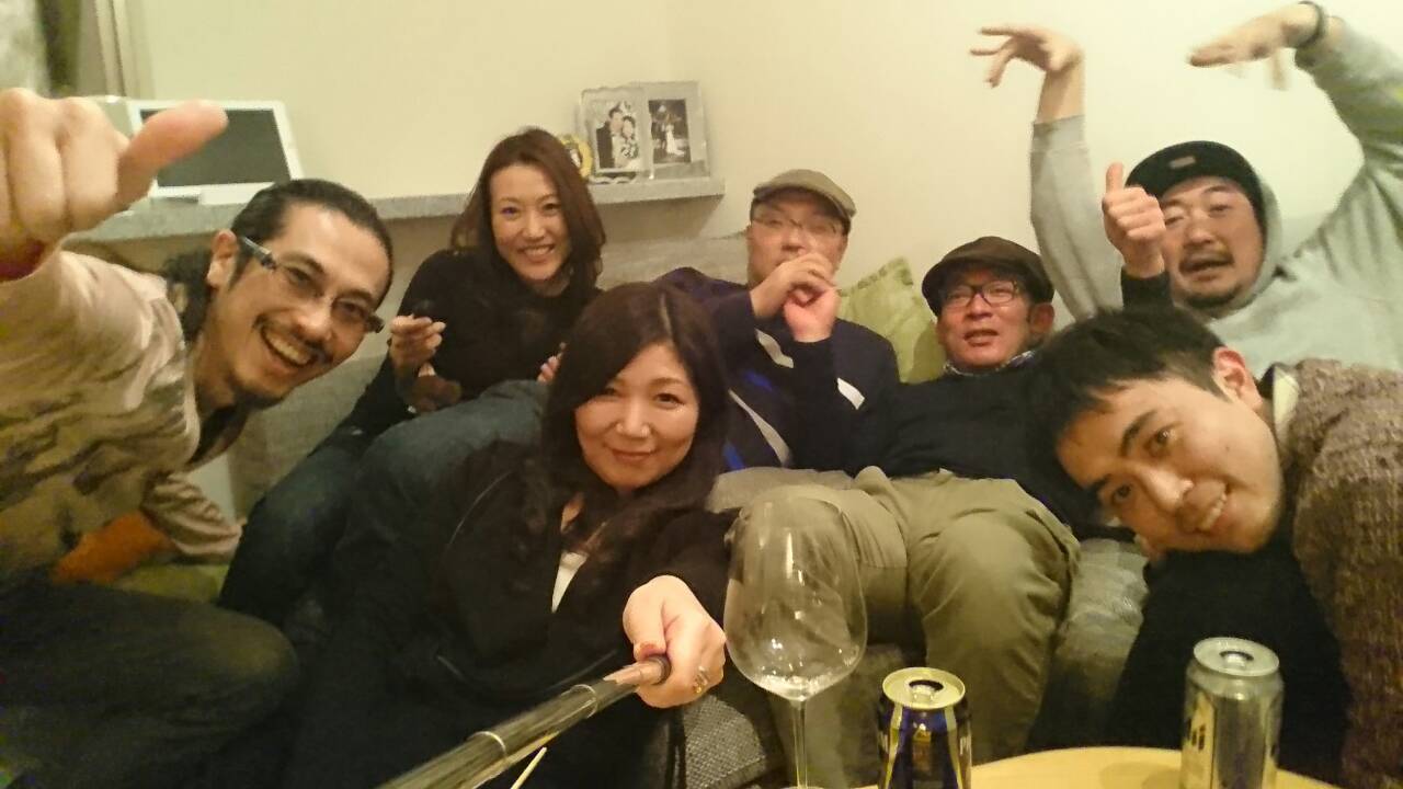 帖佐夫婦の作る創作料理に舌鼓を打ちつつ。酒が進む。一年に一度の集まり。下らねえ話ばかりで楽しかったな。これまた恒例の写真大会。今年は自撮り棒使用(笑)