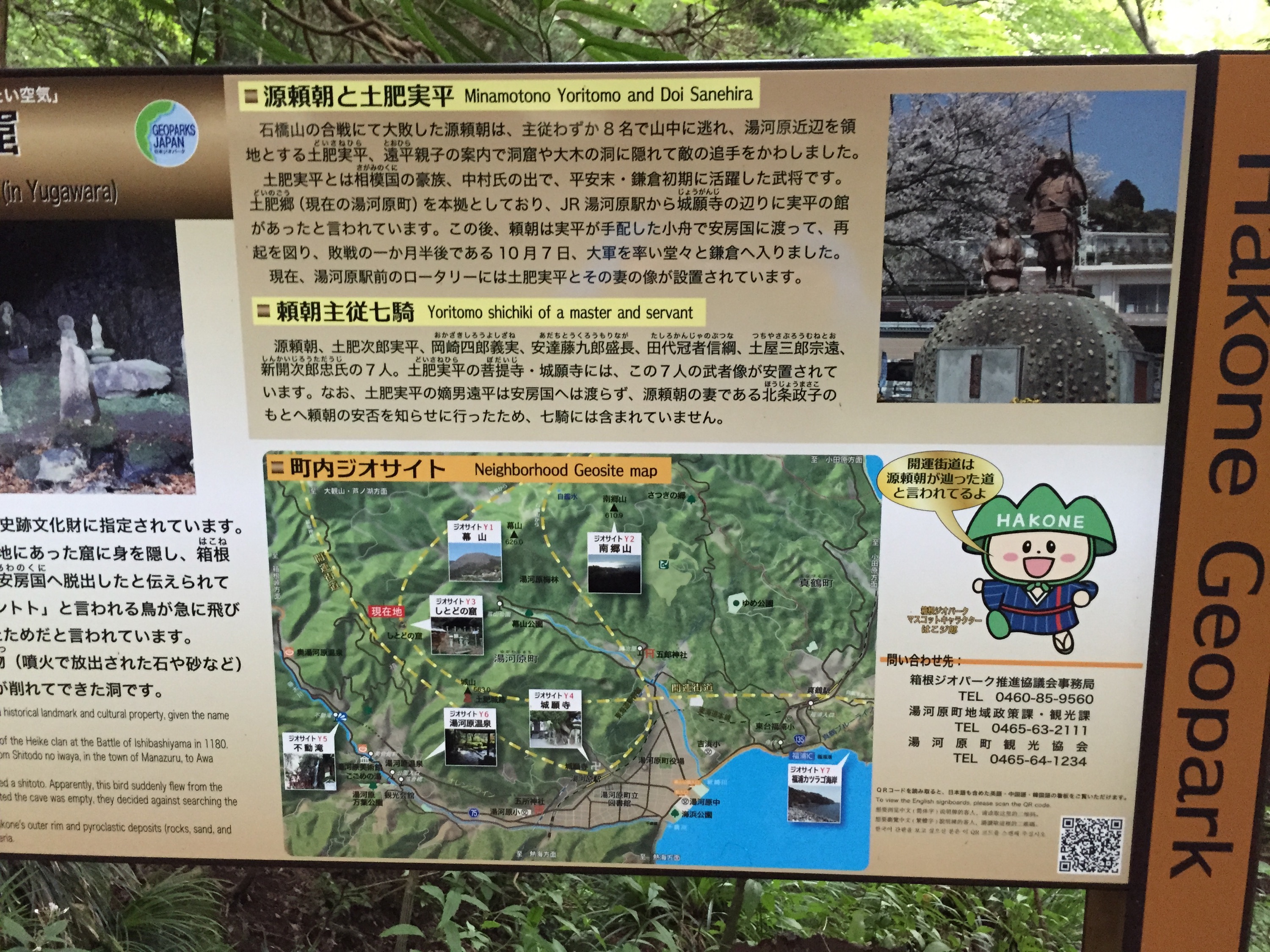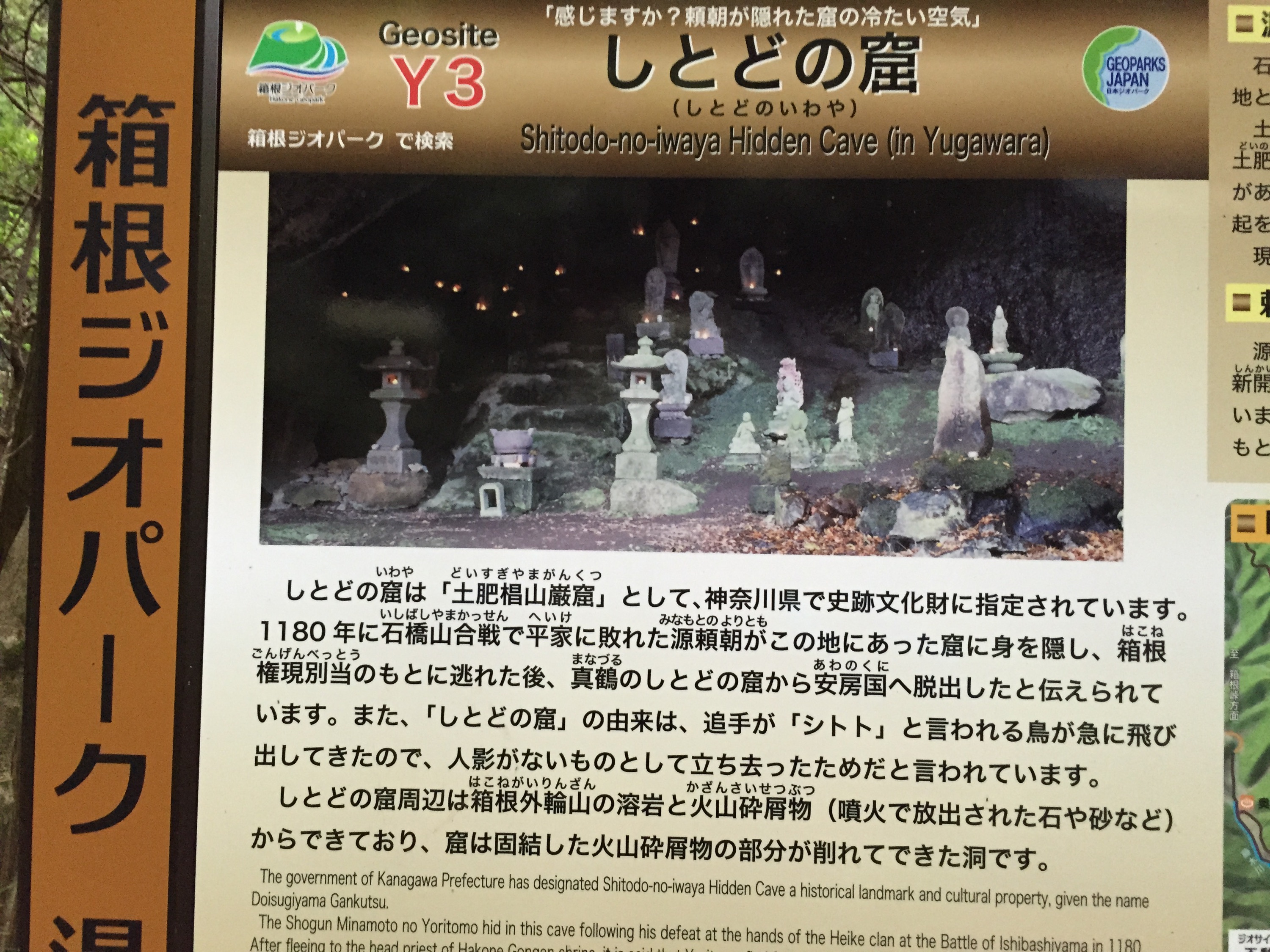 平治の乱に敗れ、伊豆に流されていた源頼朝は、治承4年(1180)8月17日、北条時政や土肥実平らの助力を得て、ついに平家打倒の兵を挙げました。伊豆国目代・山木兼隆を破って初戦を飾りますが、石橋山合戦では自軍の十倍の兵力を有する大庭景親軍に大敗を喫します。頼朝は主従わずか7名で山中に逃れ、この近辺を領地とする土肥実平・遠平父子の案内で洞窟や大木の洞に隠れて敵の追手をかわしました(七騎落)。この時、洞窟に隠れていた頼朝主従は平家方の梶原景時に発見されてしまいますが、景時はわざと見逃し、頼朝を助けたという逸話が残っています。