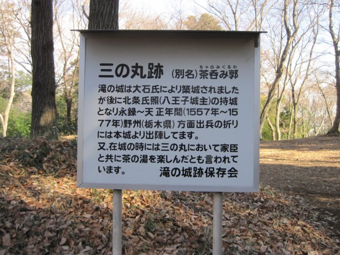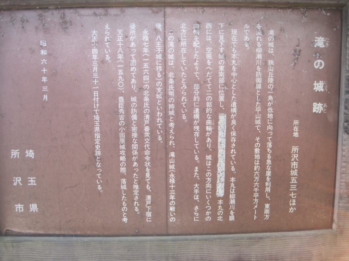 山内上杉氏の家臣であった大石氏が築城した。大石氏は当時、武蔵国(埼玉県)の多摩・入間・高麗郡を支配していた。天文15年(1546)、14代遠江守定久のとき、主君の上杉憲政が4月20日の河越夜戦で、小田原の北条氏康との戦いに敗れたので、定久は降伏し氏康の二男である氏照を養子に迎え家督を譲り、氏照は滝山城から八王子城に本城を移す中、栃木(野州)への前衛の支城になっていたようだ。現在の遺構は戦国時代のものであり、鋭角的な堀や多用された横矢などに後北条氏の支城として使用された築城形態を色濃く残している。滝の城の南を流れる柳瀬川の対岸には北条氏照によって清戸番所が置かれ、氏照配下の三田氏らが交替で守っていた。氏照は清戸番衆に対し「この地は大切な場所である。遅参する者あらば全員切腹」という厳命を下している。永禄7年~天正5年(1564~1577)、氏照の下野国(栃木県)出兵時には陣揃えが行われたという。天正15年(1587)、氏照が八王子城に移ると、八王子と北関東を結ぶ重要な連絡拠点となる。天正18年(1590)、豊臣秀吉の小田原攻めで落城し、徳川家康の領土となり廃城となった。北側に外堀、東北に大手、東側に城の名にゆかりの滝、西北に搦手と規模は小さいが要害堅固な城郭をなしていた。