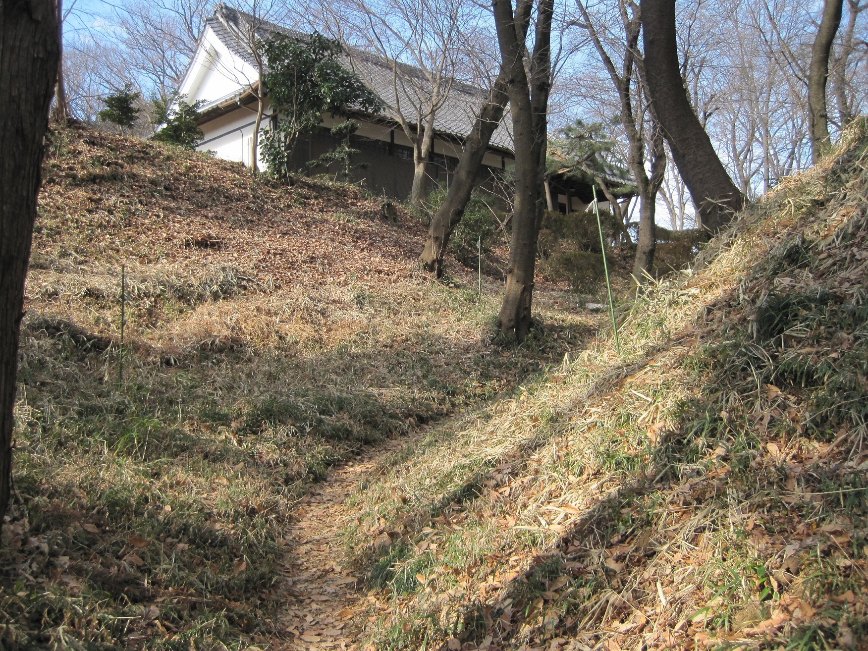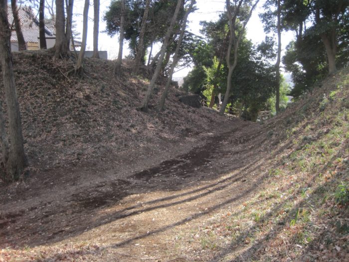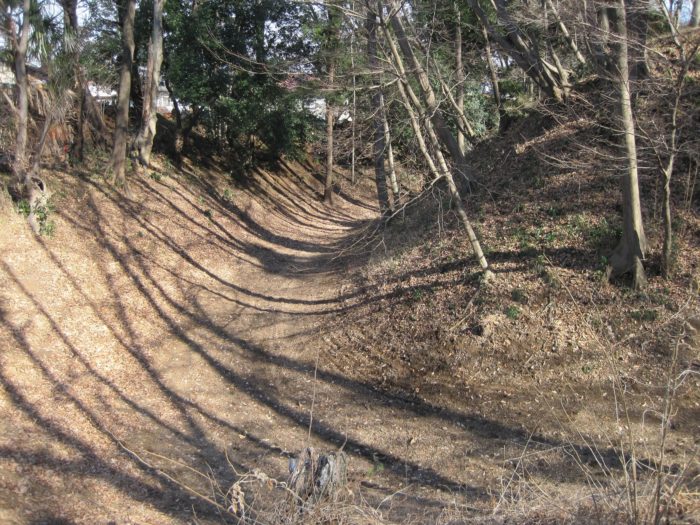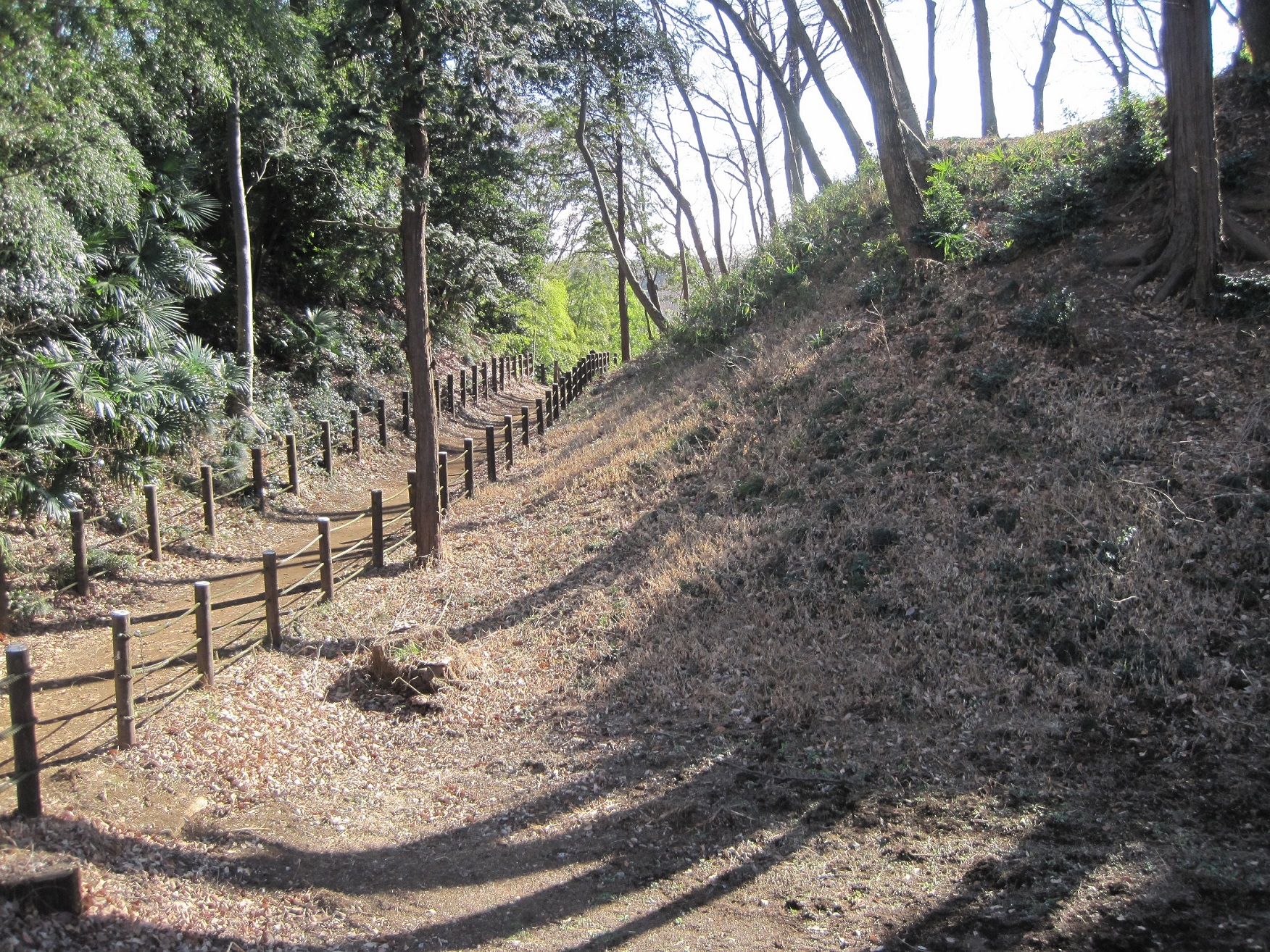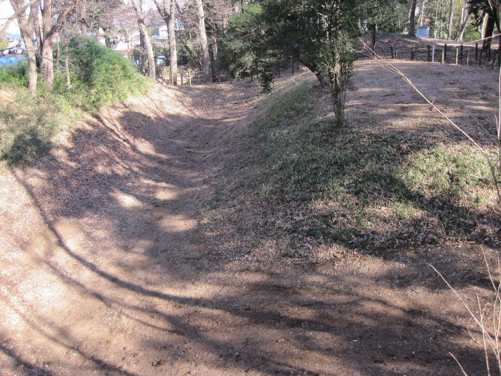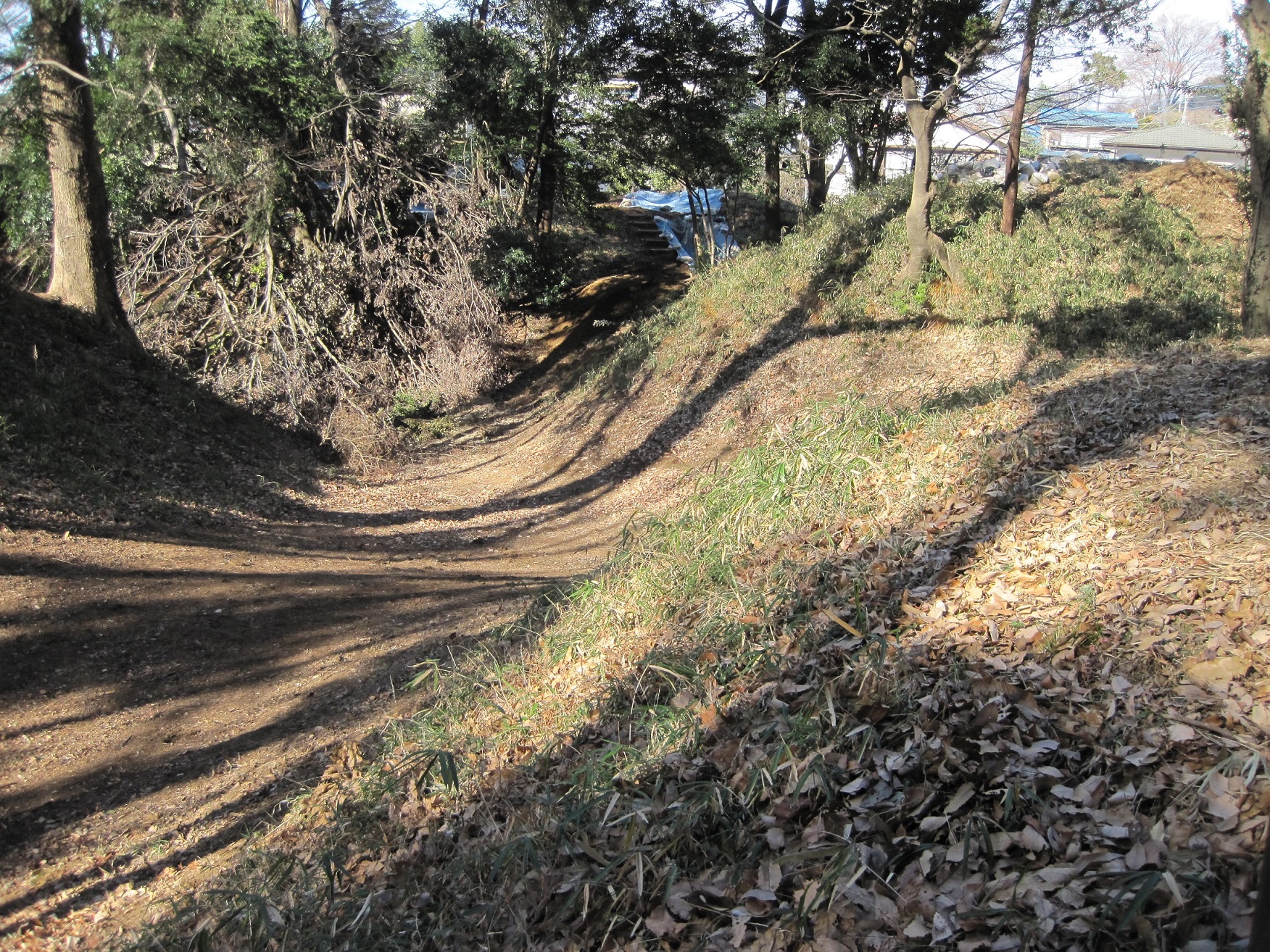 水田跡(滝の城址公園)、本丸跡(25mの断崖上)、本丸を囲むように二の丸・三の丸・物見櫓跡、土塁や空掘が残る。柳瀬川に臨む段丘を利用して築かれた城郭で、北側に外郭を形成する堀と土塁が存在していたが、宅地開発により一部しか残っていないそうだ。城山神社への入口が二の郭跡となっていて、そこまでの道沿いに二重堀の遺構がはっきりと確認できる。三の郭跡や二重堀が見事にその姿を現しており、滝の城の遺構の素晴らしさが浮き彫りとなってきたみたいね。郭の周囲には今も深い空堀が縦横に巡らされており、中世城郭の巧妙な縄張を存分に堪能できるよ。