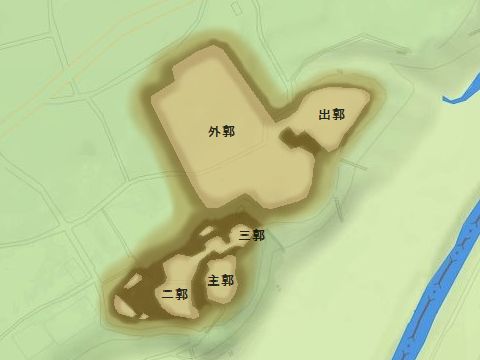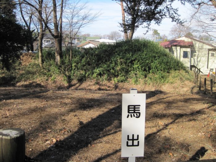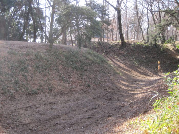 門跡から見た、馬出と二の丸の土塁と空堀。