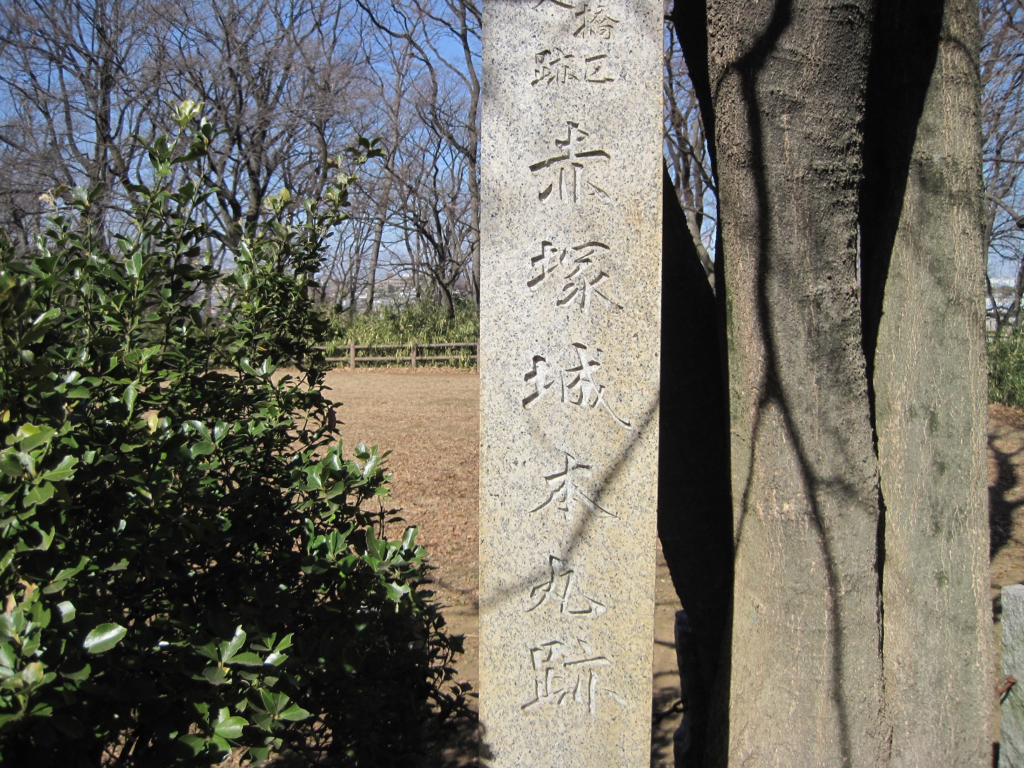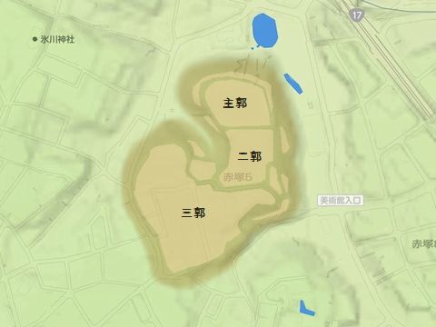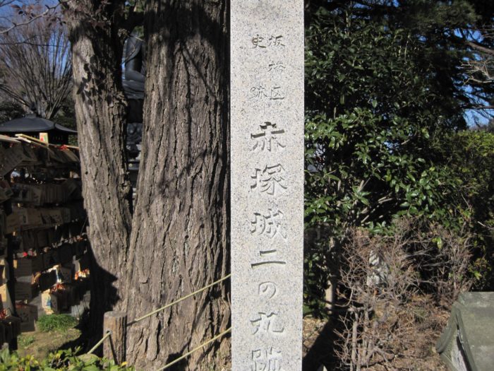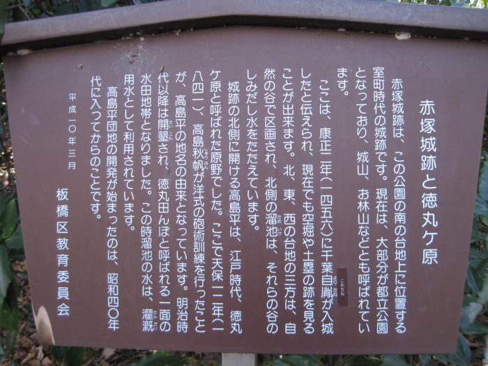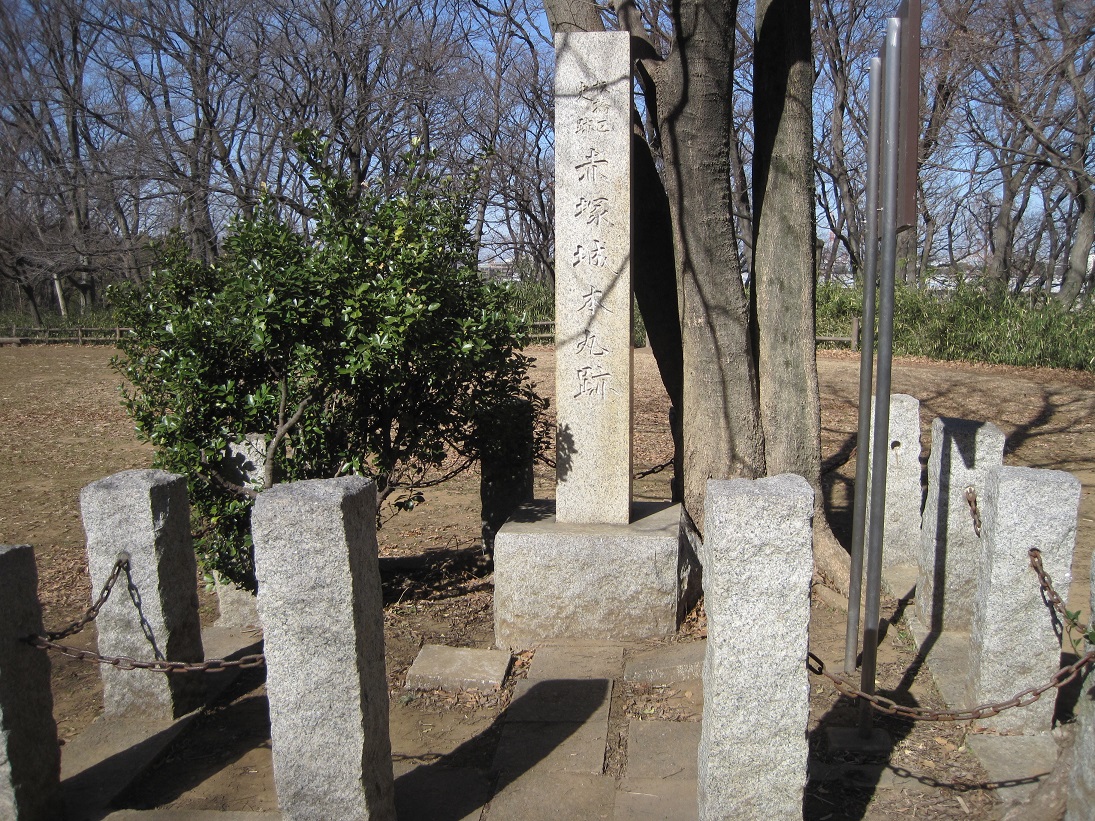 都内の巨大住宅地高島平のすぐそば、現在は赤塚公園の一部として城址が残ります。高島平団地付近の開発が始まった昭和四十年代頃までは、この赤塚城もほぼ手つかずで、空堀などの遺構がはっきり残っていたようですね。もともとは荒川の河岸段丘上に築城され、段丘の下は荒川氾濫原の湿地帯に守られた堅固な城だったようです。現在城址の碑が建つ丘が本丸跡と言われ、その周囲に二ノ丸・三ノ丸にあたる曲輪があったと言われます。