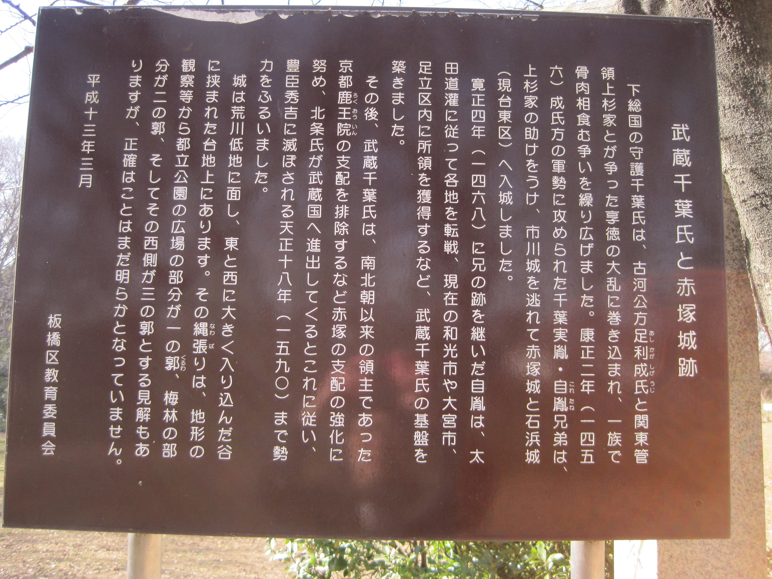 桓武平氏の流れを汲む名門千葉一族は、関東における戦国のきっかけを作った享徳三(1454)年勃発の、関東公方・足利成氏と上杉氏の抗争となった「享徳の大乱」に呼応した下総千葉氏の内紛で、康正元(1455)年、千葉氏庶流の馬加城主・馬加氏は亥鼻城を陥とし、千葉氏嫡流の千葉介直胤・胤宣父子は下総香取郡の多古城・志摩城に追い詰められ自刃、千葉介は馬加氏によって奪われた。直胤の弟・胤賢も小堤城で自刃した。その子実胤・自胤は市河城(国府台城)で馬加氏に抵抗したがこれも陥とされ、扇谷上杉氏を頼って武蔵に逃れた。太田道灌は千葉氏嫡流の二人を庇護し、実胤は武蔵石浜城に、自胤は赤塚城に置かれて「武蔵千葉氏」となった。千葉自胤は太田道灌の配下として、石神井城に籠る豊嶋氏の鎮圧や、文明十一(1479)年、長尾景春方の千葉孝胤を討つため太田道灌の弟・太田持資、資忠の軍が臼井城を攻めた際にも主力の一翼として参加したが下総奪還は果たせず、太田道灌の死後は北条氏の配下となった。天正十八(1590)年の小田原の役では武蔵千葉氏配下の松戸越前守が守備していたが、北条氏と運命をともにし、赤塚城も廃城となった。名族千葉氏はここに終焉を迎えてしまう。