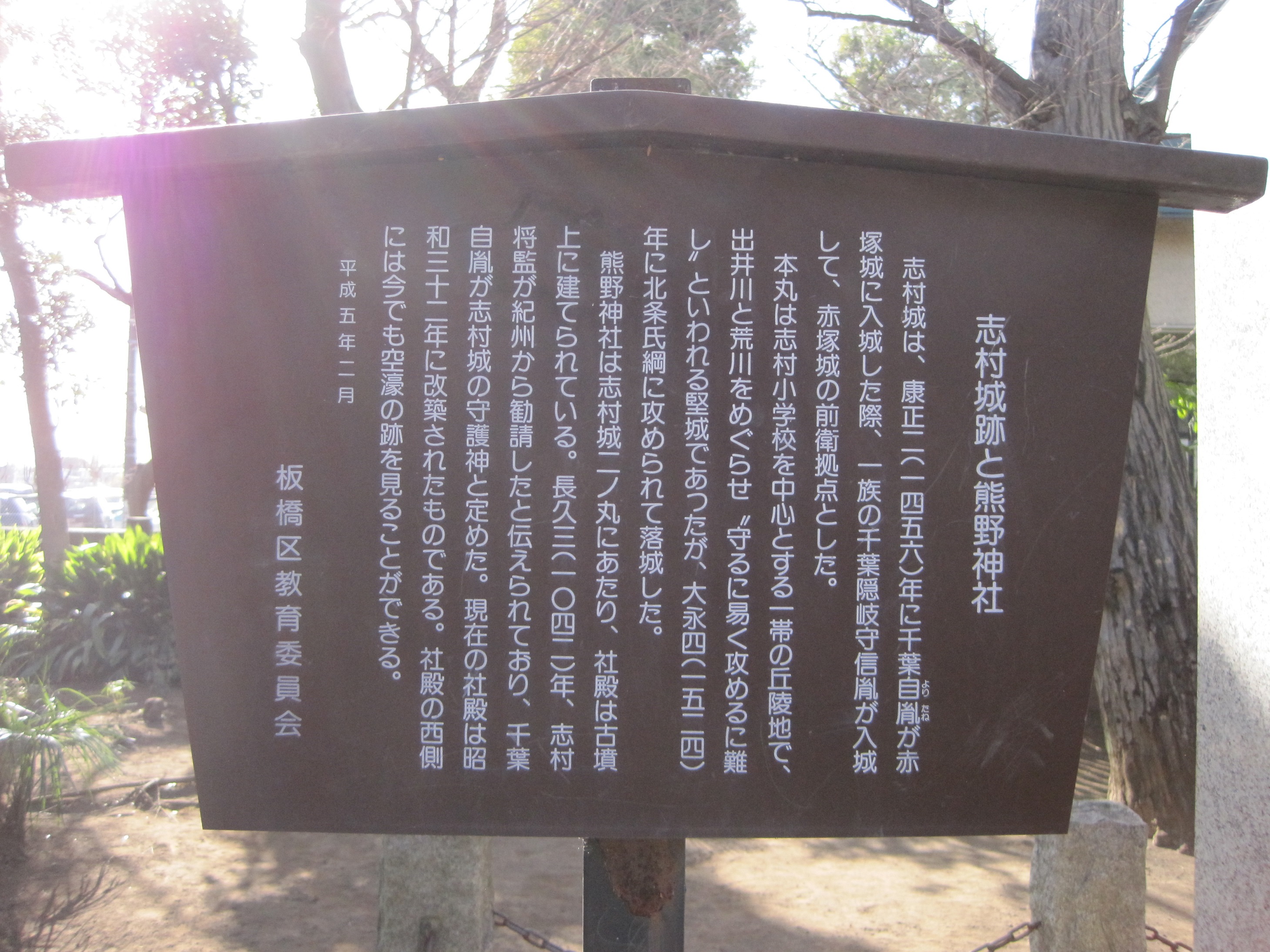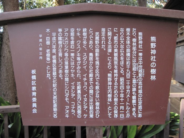 城址に建立されている熊野神社の社伝では長久3(1042)年に志村将監が紀州熊野から神社を勧請して創建したと伝えられている。一族の千葉隠岐守信胤の名にちなんで、城址近くの坂道は今も隠岐殿坂と呼ばれているそうだ。