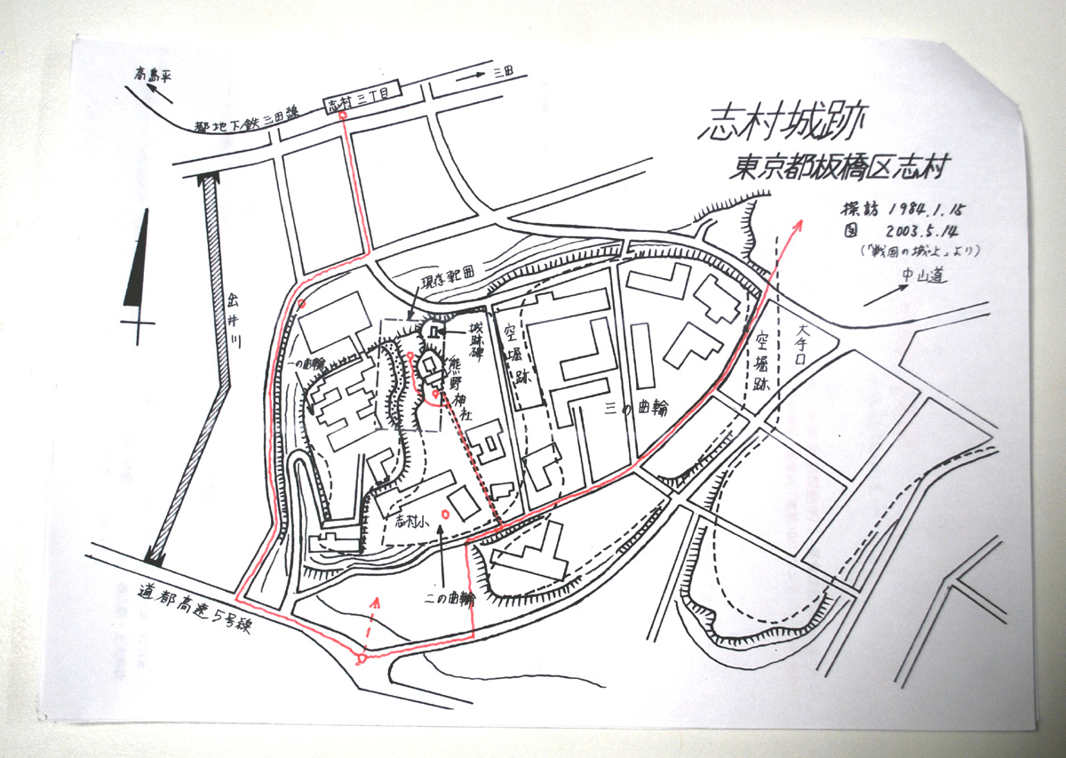 豊嶋氏の一族である志村氏の築城といわれる。康正元(1455)年、下総千葉氏の内紛で、千葉氏庶流の馬加城主・馬加氏は亥鼻城を陥とし、千葉氏嫡流の千葉介直胤・胤宣父子は下総香取郡の多古城・志摩城に追い詰められ自刃、千葉介は馬加氏によって奪われた。直胤の弟・胤賢も小堤城で自刃した。その子実胤・自胤は市河城(国府台城)で馬加氏に抵抗したがこれも陥とされ、扇谷上杉氏を頼って武蔵に逃れた。大永四(1524)年に北条氏綱に攻められその後、扇谷上杉氏重臣の太田道灌によって庇護され、実胤は石浜城、自胤は赤塚城にそれぞれ入り「武蔵千葉氏」となり志村城は赤塚城の支城として機能したと考えられているようだ。廃城時期なども不詳のようですが、おそらくは小田原の役で、他の後北条氏系の城砦同様に落城などの運命を辿ったと考えられている。