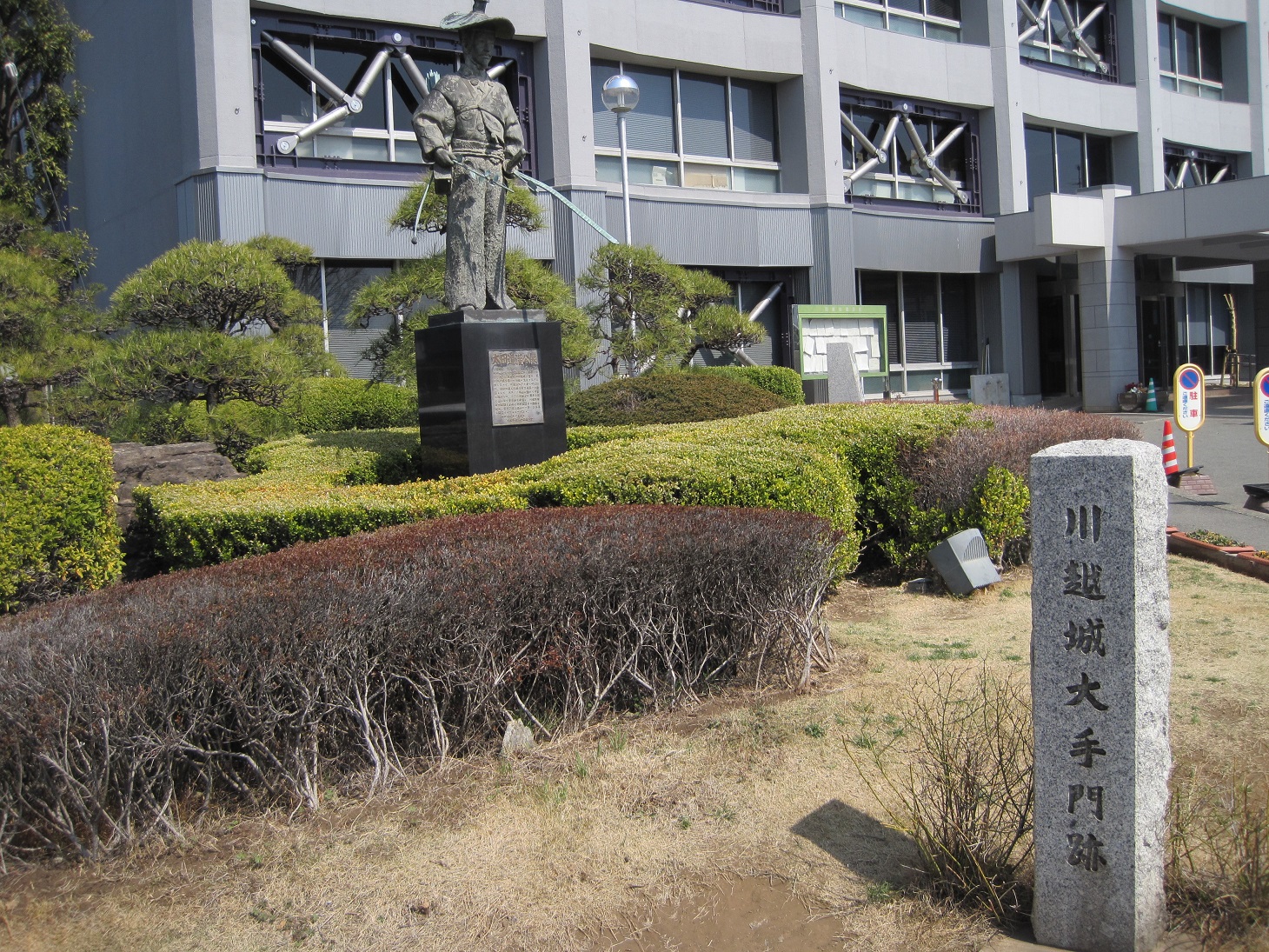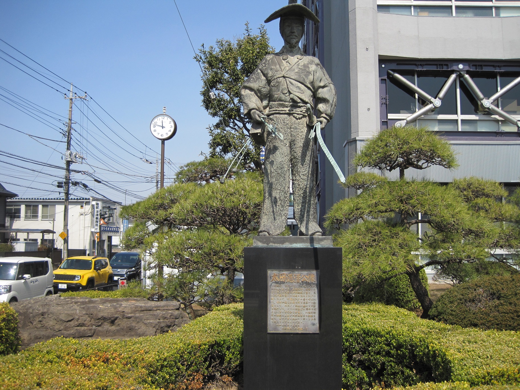 札の辻を曲がると急に静かに。城に行く人少ないね。市役所の前に大手門跡と太田道灌の像。