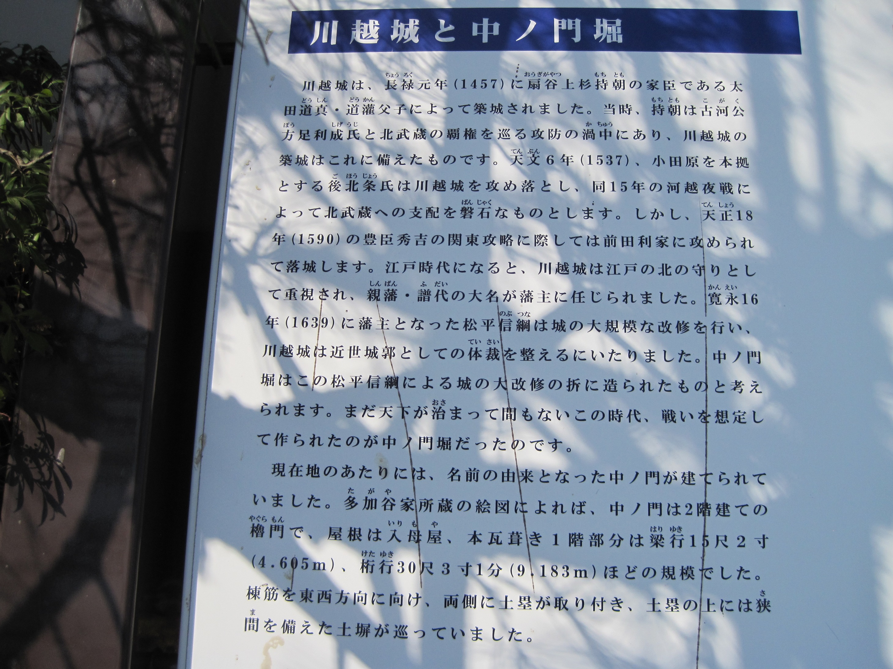 長禄元年(1457)、古河公方足利成氏と抗争を展開していた扇谷上杉持朝が太田道灌に命じて川越城を築かせたという。川越城の他にも江戸城や岩付城など多くの名城を築いた名築城家としても知られた道灌であるが、父道真や主家上杉氏の事跡も後世に道灌の手によるとされてしまったものも多いようで、川越城も扇谷上杉氏によって築かれたという説も有力視されている。いずれにしても当時の川越城は現在の本丸と二の丸を合わせた程度の規模だったらしい。
