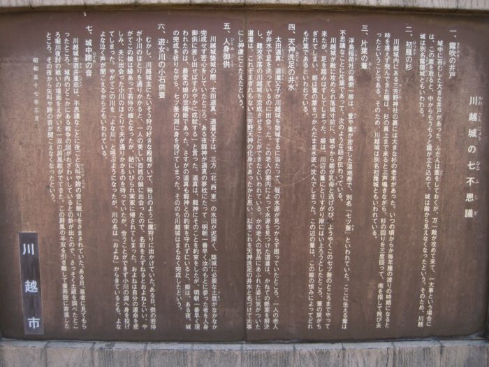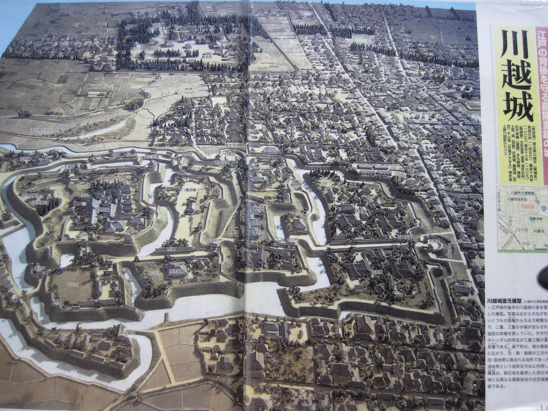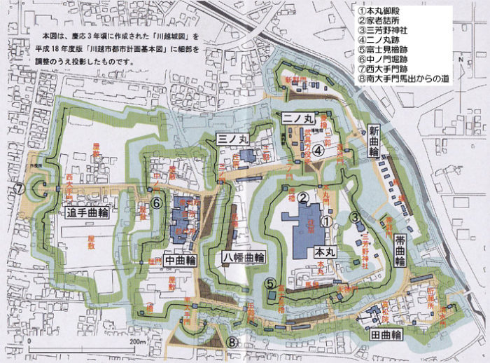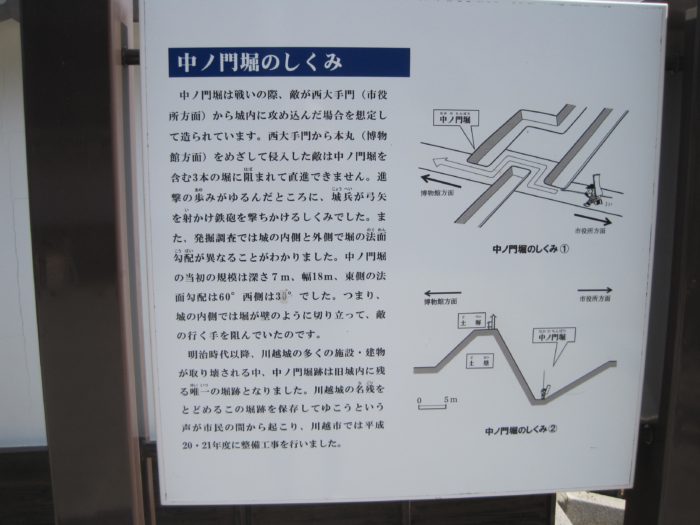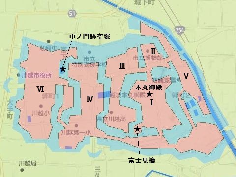 川越城は江戸幕府が重要視した要地であったため、明治新政府により旧権力の象徴として徹底的に破壊されたそうだ。また戦後は都心からの通勤圏として開発が続けられたため、城の遺構は失われ、本丸周辺の御殿の一部や富士見櫓の土塁を除けば、ほとんどその痕跡を残していない。そのため、現地を散策しても全体像をつかむのは難しくなっている。石垣を使用しない土の城だったこともその一因だったようだ。