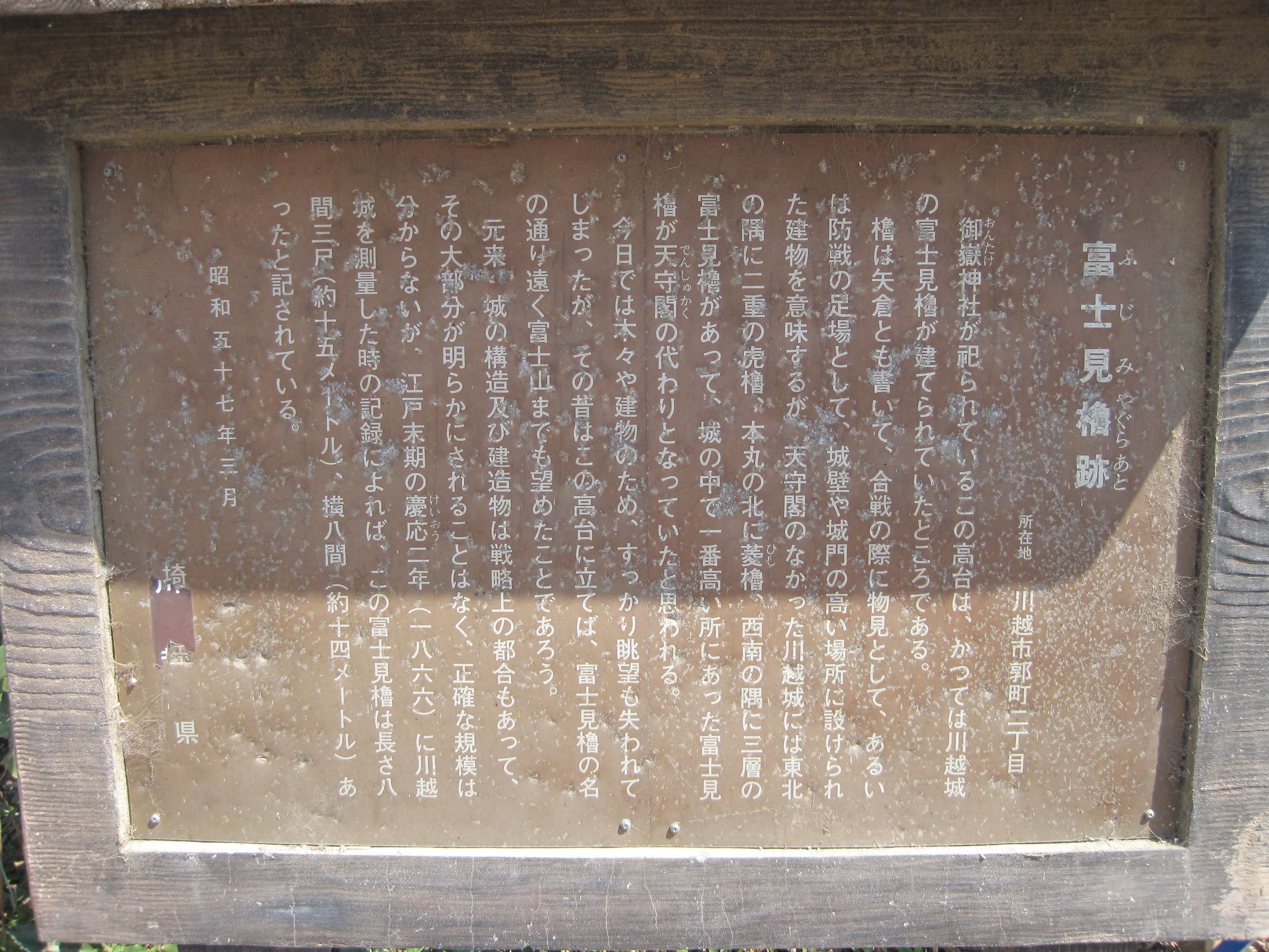 それでも残された遺構は江戸城の守りとしての格式を十分に伝えるものであり、天守に相当した富士見櫓の壮大な土塁は見事だ。埼玉県下では唯一の本丸御殿の一部が現存しているのも嬉しいね。浄水場の東側には外郭の水堀の痕跡が残り、童謡『通りゃんせ』発祥の地とされる三芳野神社にも土塁が残っている。城跡そのものは大部分破壊されているが、周辺は蔵造りの街並など見所も多く小江戸と呼ばれて繁盛した城下町の雰囲気をよく伝えていると思う。今度は平日に空いてる日があれば、ゆっくり街並みを散策したいな。