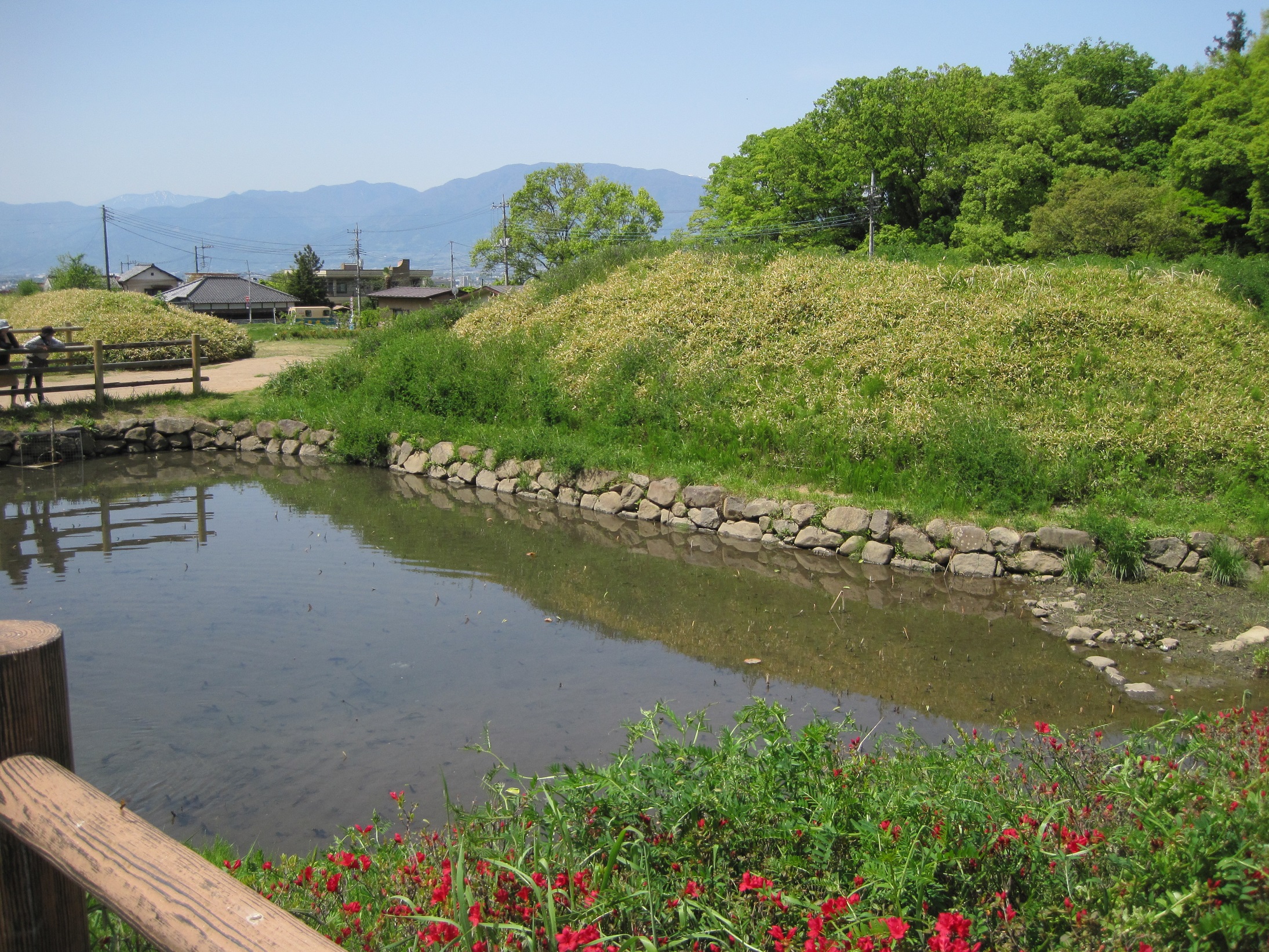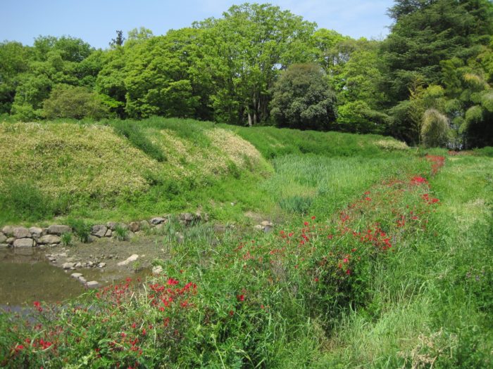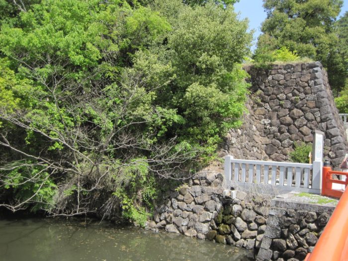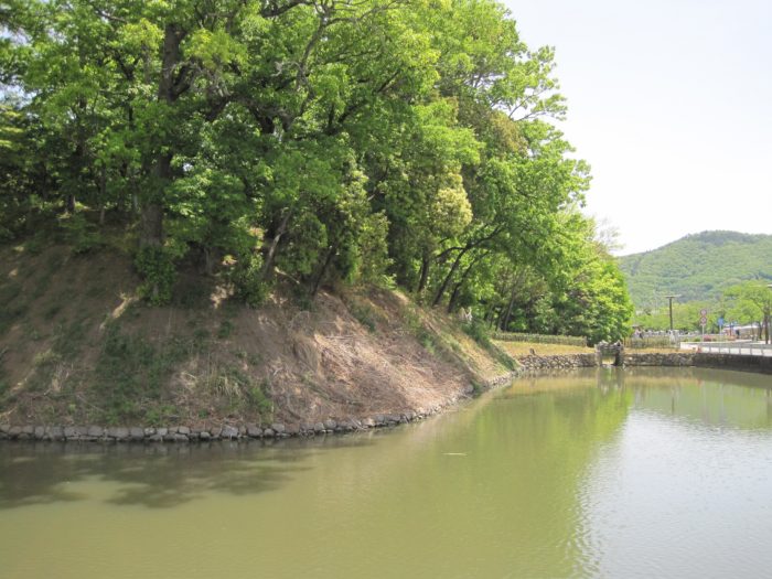 西曲輪にある駐車場より水堀から攻める。土塁と堀の組み合わせもイカすよねえ。腰巻石垣と言うそうです。