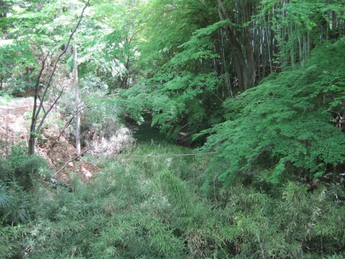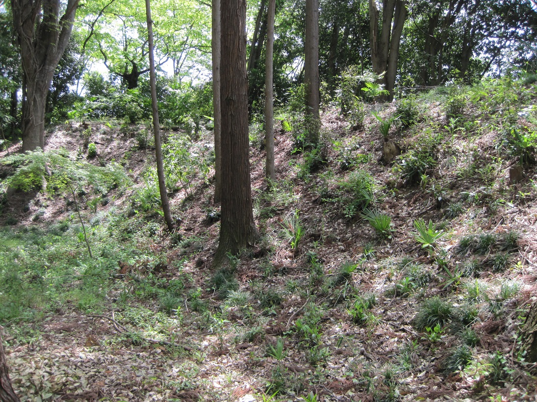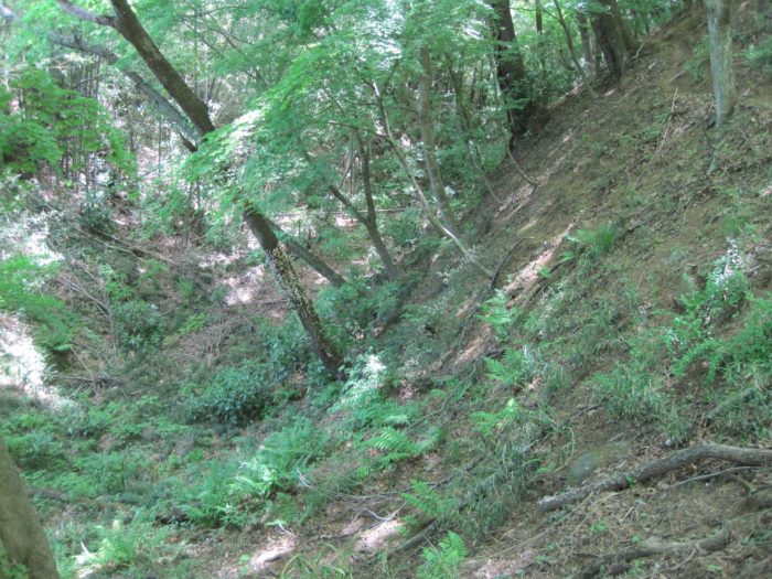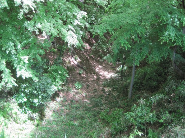 西曲輪と本曲輪の間の堀跡。水は抜かれてるが深い。