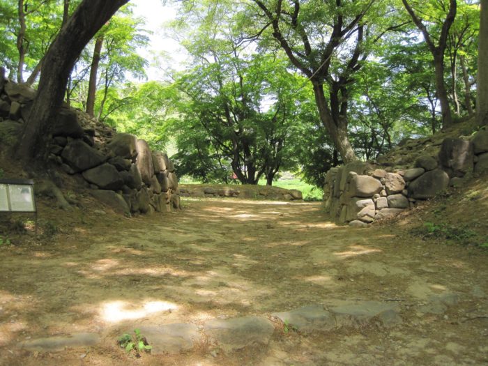 土橋から見た西曲輪桝形虎口。