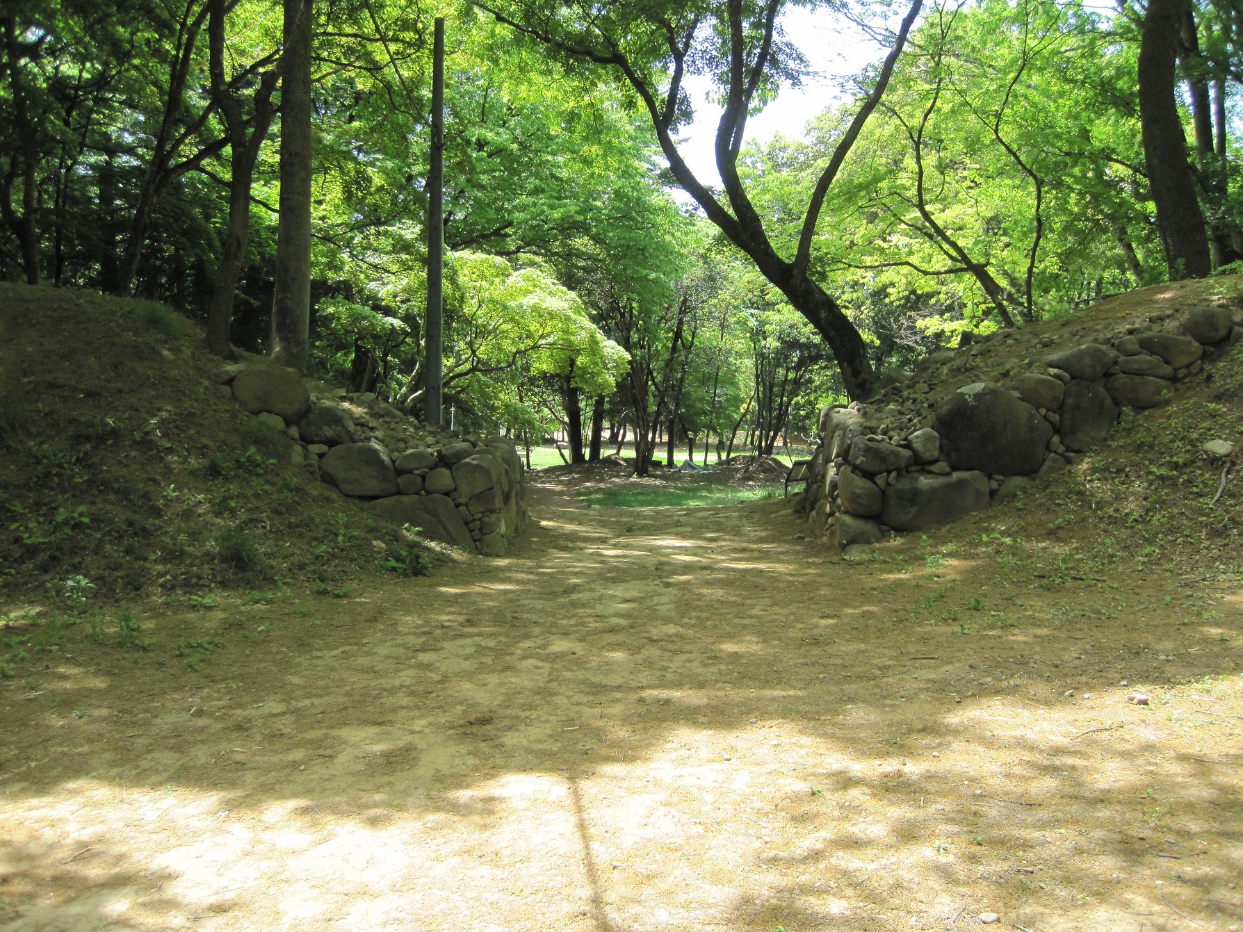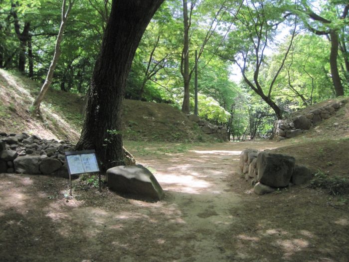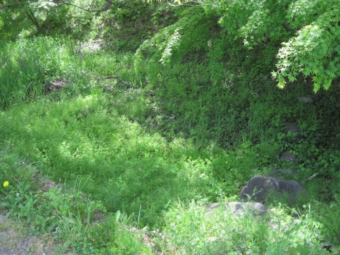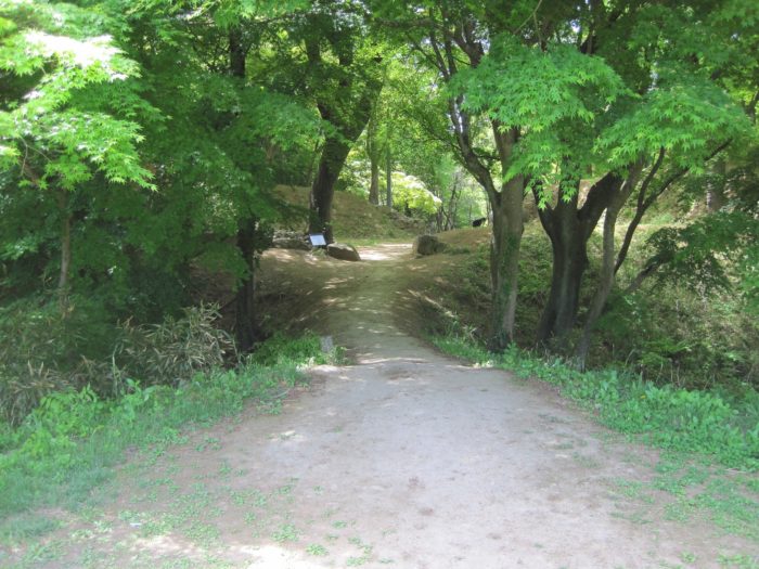 東曲輪と大手門の堀。縄張図を見ると、かつては、ここも水堀だった事が伺える。結構深い。