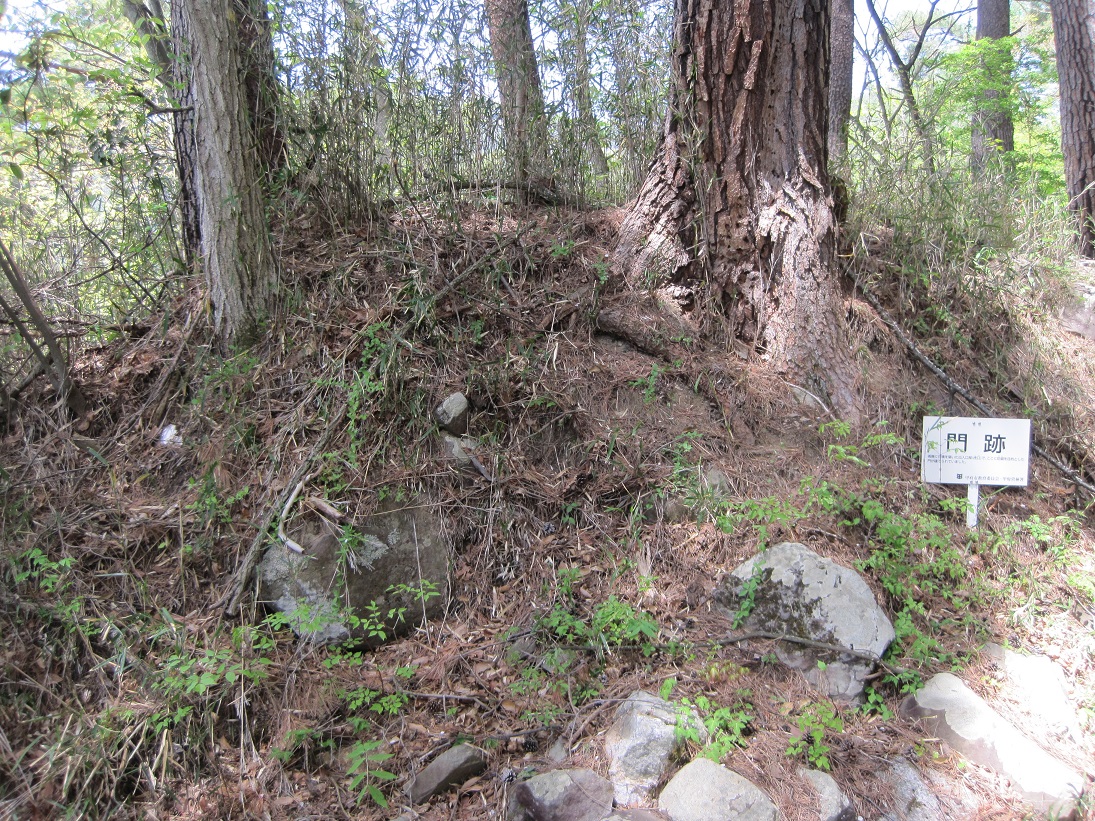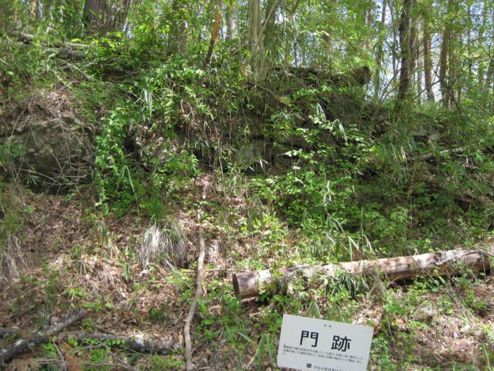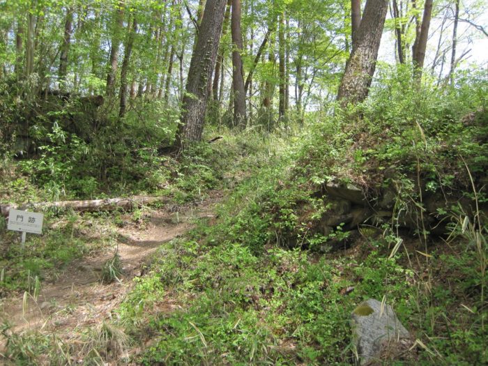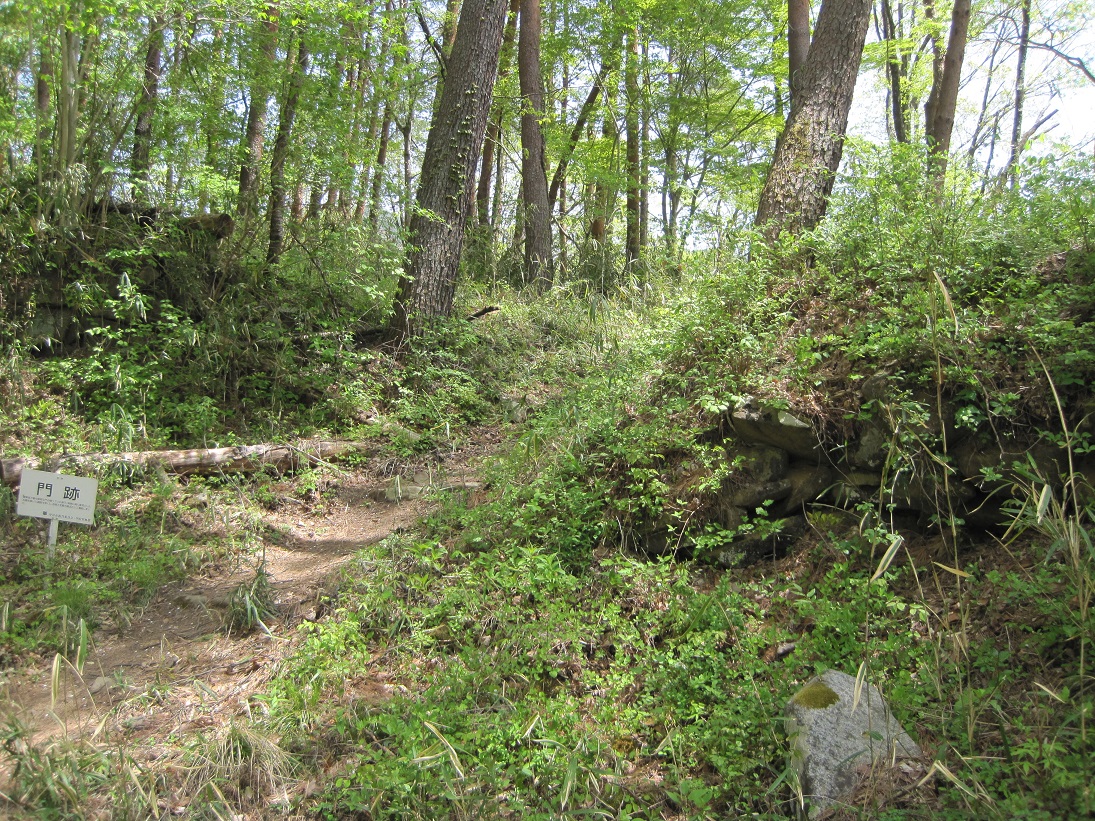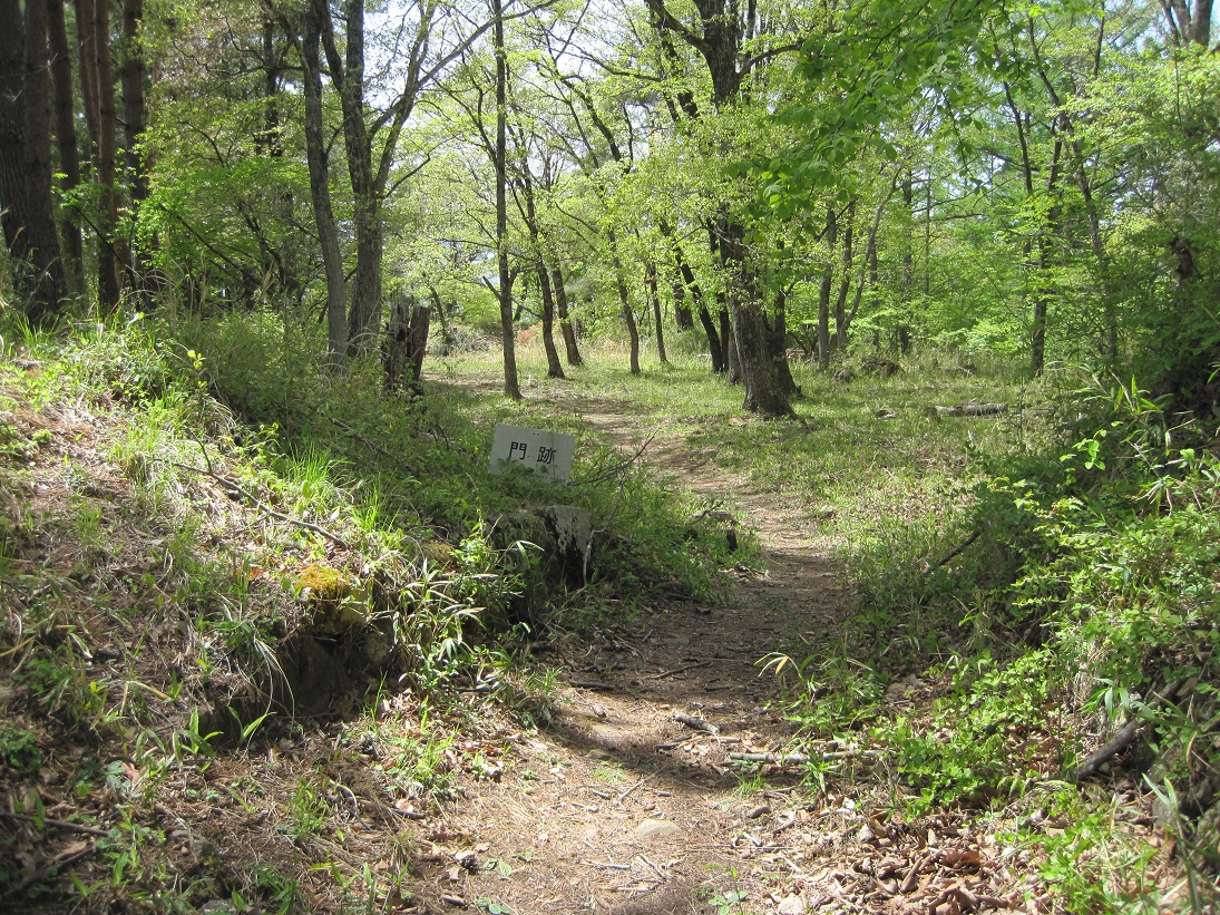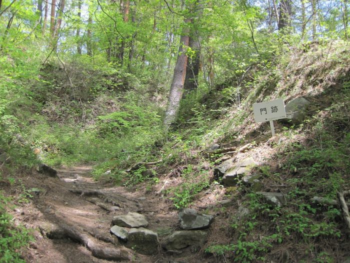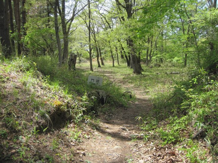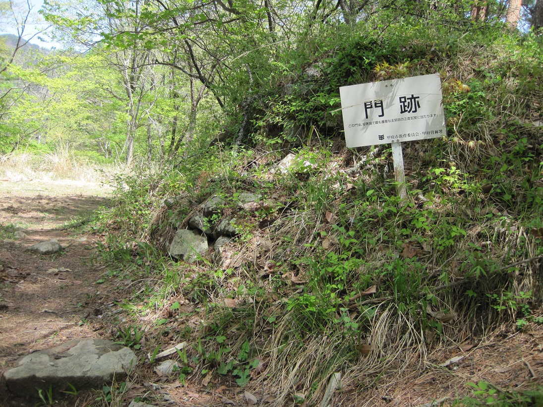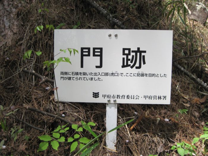 要害山城は典型的な中世山城の格好をしています。山麓には「信玄産湯の井戸」がある積翠寺があり、この付近から登ると、まず数段の腰曲輪群が現れます。このあたりが山麓の大手口だったのだろう。10分ほど登ると、竪堀、土塁などとともに、多くの門跡(虎口)、曲輪が現れます。この門跡には石積みと枡形を伴うものが多く、とくに二の門の巨石を用いた石組みはお見事。主郭は長方形の広い曲輪で、周囲を土塁がほぼ全周しています。とくに搦手に向う枡形の土塁は重厚。主郭には「武田信玄公誕生の地」の碑も建っています。ここまででもかなり充実していますが、搦手からの尾根続きを進むとやはり門跡、石組みなどとともに、今度は多くの堀切、竪堀、土橋などが連続します。特に主郭搦手虎口背後の堀切などは堀切の断面にも石組みが見られる、珍しいものです。