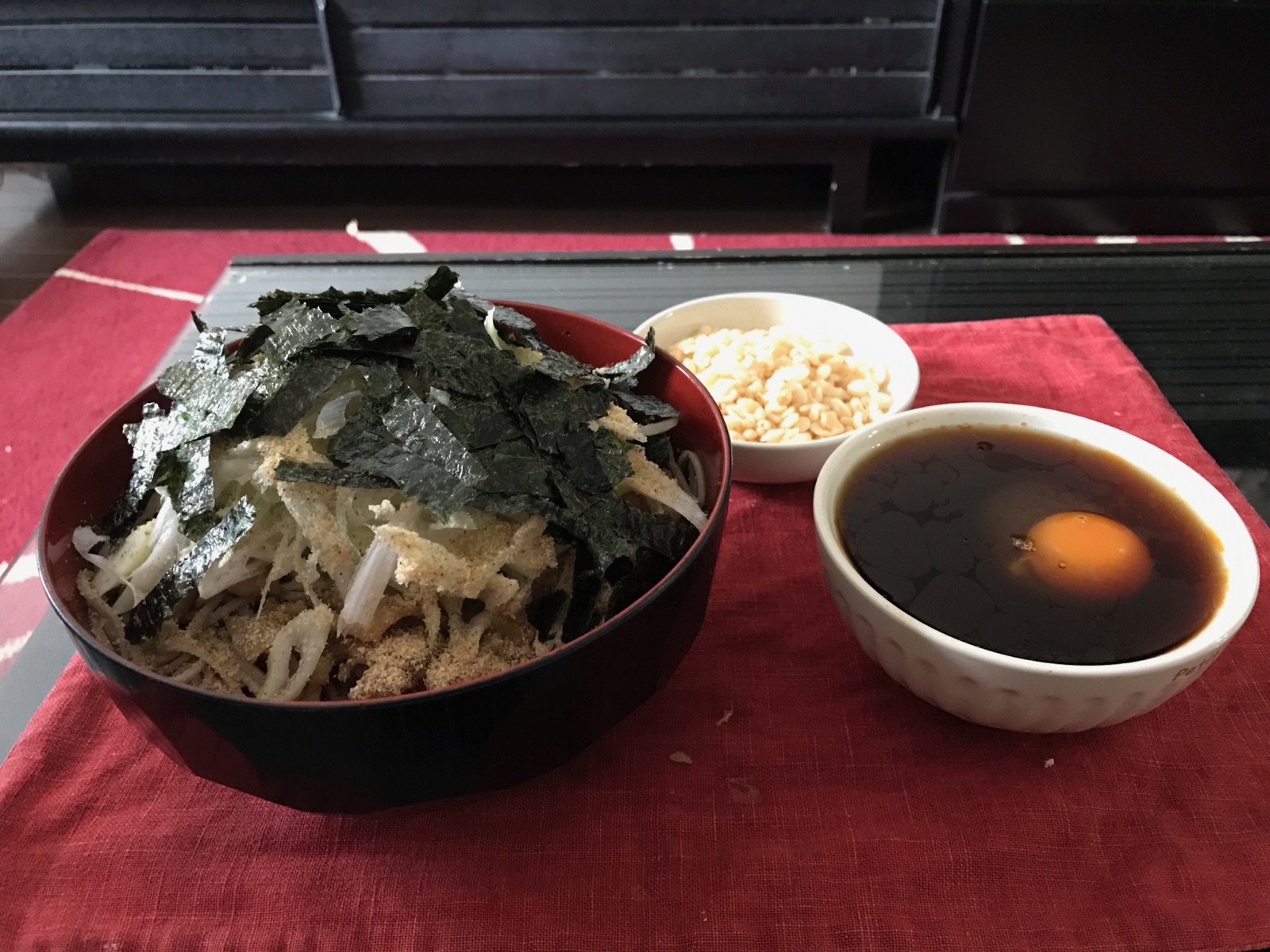そばつゆにラー油と生卵と天かす。蕎麦の上に大量の甘辛に焼いた豚肉と、これまた大量のネギとゴマと海苔をのっけて。