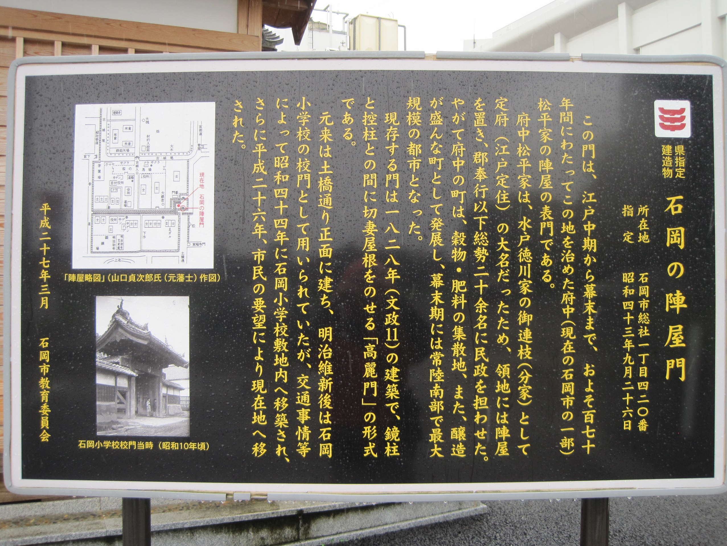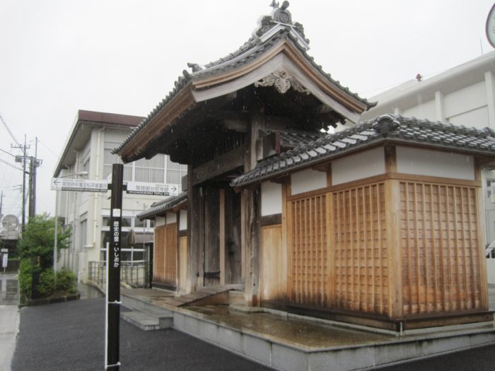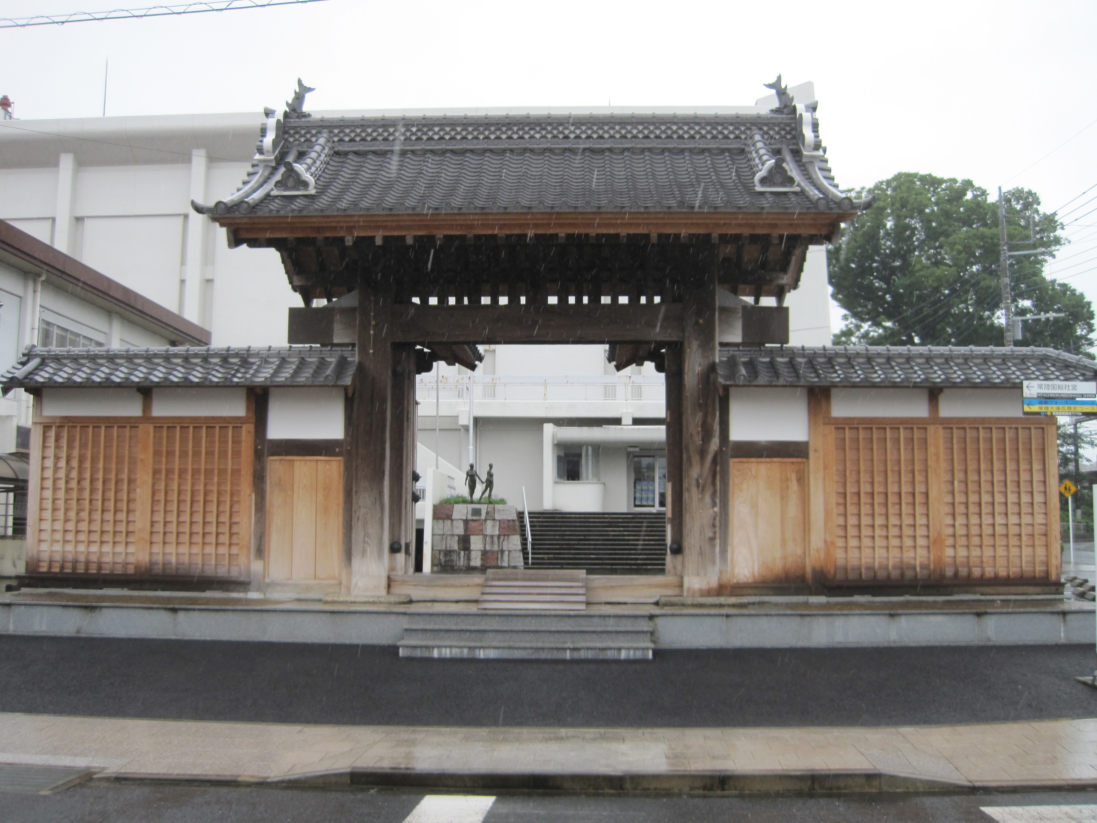 この日、雨の降る中、二つ目の城攻め。常陸府中城へ 。学校の前にそびえる陣屋門。