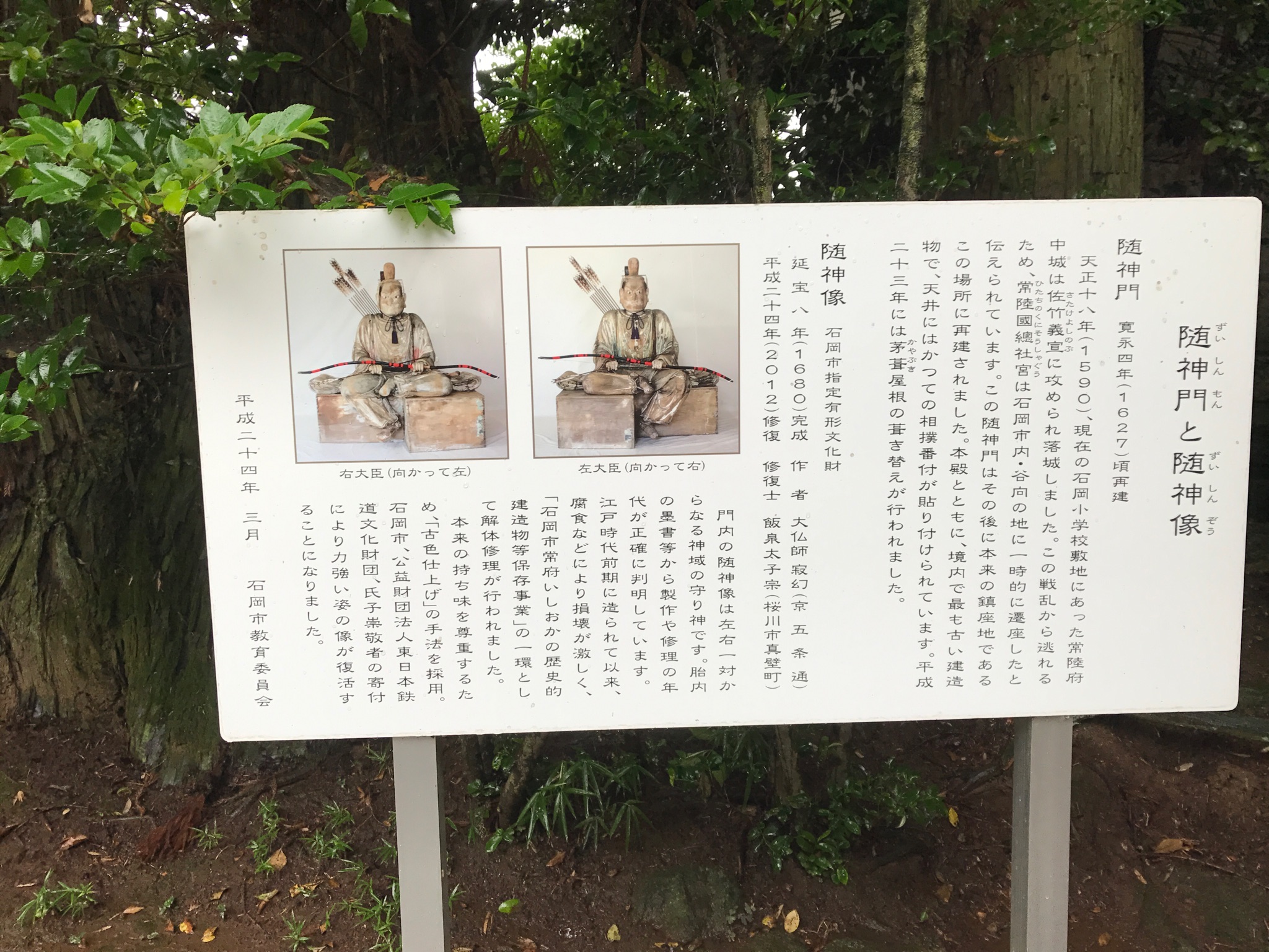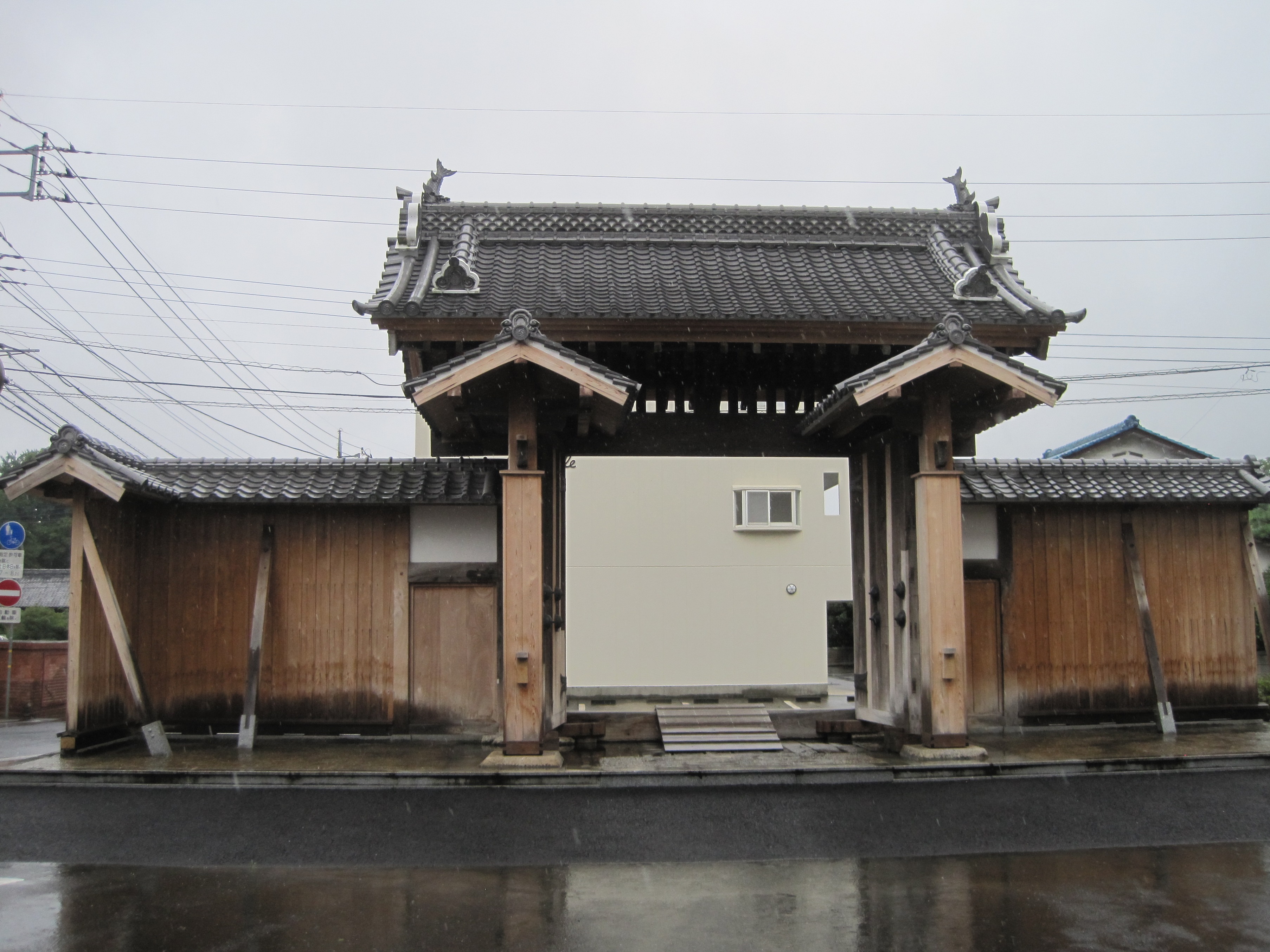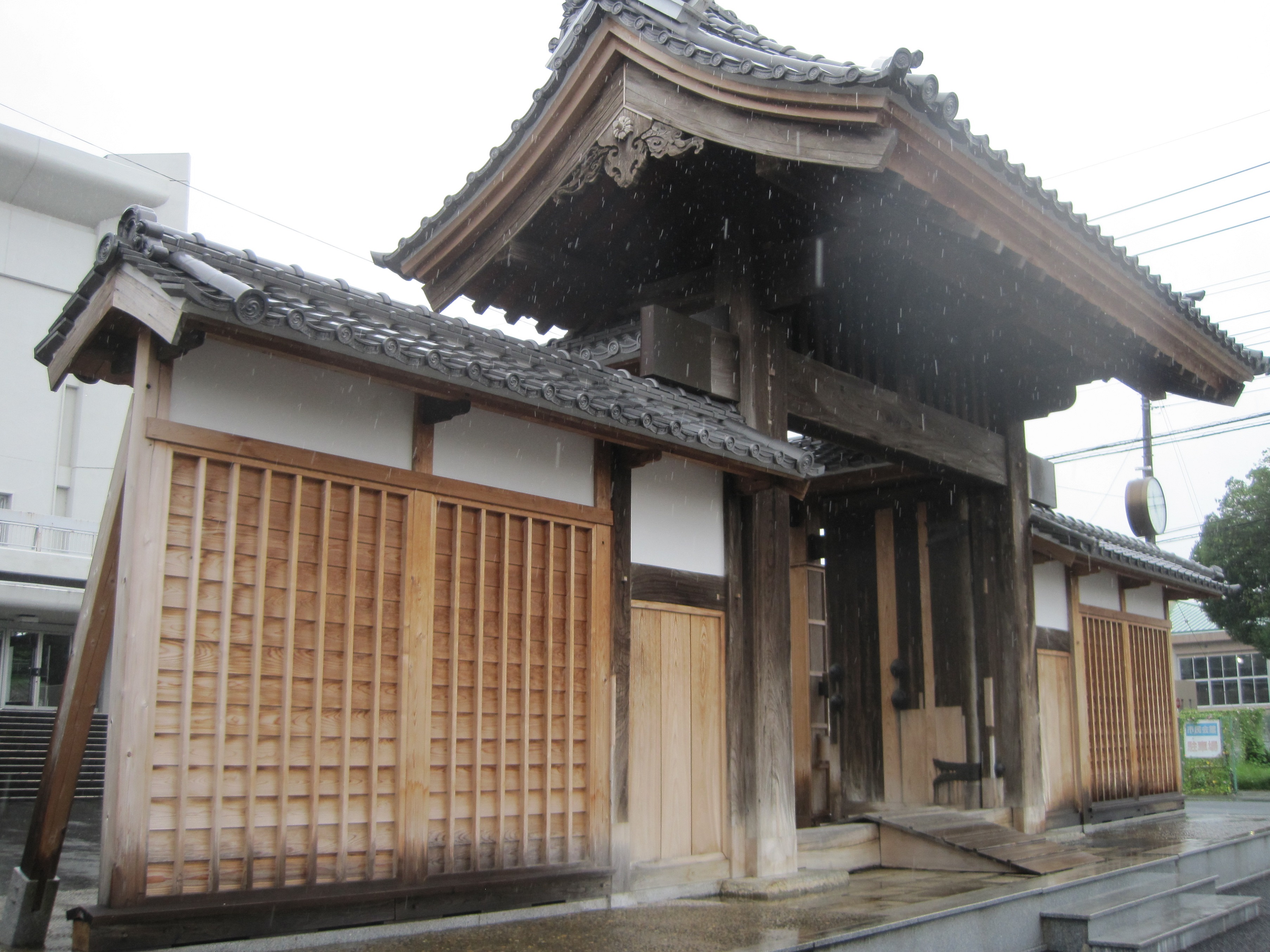 この日、雨の降る中、二つ目の城攻め。常陸府中城へ 。学校の前にそびえる陣屋門。