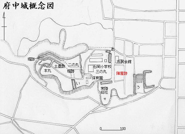 鎌倉時代から安土桃山時代にかけての城郭で、江戸時代には水戸藩の支藩(常陸府中藩)の陣屋が置かれた。往時の府中城は、丘陵の上に築かれ、本丸、二の丸、三の丸や3つの出丸を配置し、幾重にも濠をめぐらした堅固な城郭だった。鎌倉時代初期の1214年(建保2)に、大掾(馬場)資朝がかつて常陸国の国衙が置かれていた場所に別館を築いたのがその始まりとされる。南北朝時代の1346年(貞和2)に、馬場城(水戸城の前身、同県水戸市)を本城とする馬場詮国がこの館を城郭として改修した。1426年(応永33)、馬場城が江戸通房により攻略されたことから、馬場氏は府中城を本城としたが、馬場浄幹の代の1590年(天正18)に佐竹義宣によって攻略され、馬場氏は滅亡。府中城は佐竹氏の城となり佐竹義尚が入城した。しかし、関ヶ原の戦いで佐竹氏は西軍に与したことから、1602年(慶長7)に秋田に国替えとなり、府中城には六郷氏が、次いで皆川氏が入封した。その後、1700年(元禄13)、水戸藩主徳川頼房の五男の松平頼隆が2万石で府中に入封し、以後頼隆の家系が10代続いて、水戸藩の4支藩(讃岐高松・陸奥守山・常陸府中・常陸宍戸)の一つとして明治を迎えた。文政年間(1818~29年)には府中城跡に陣屋が建てられ藩庁となった。