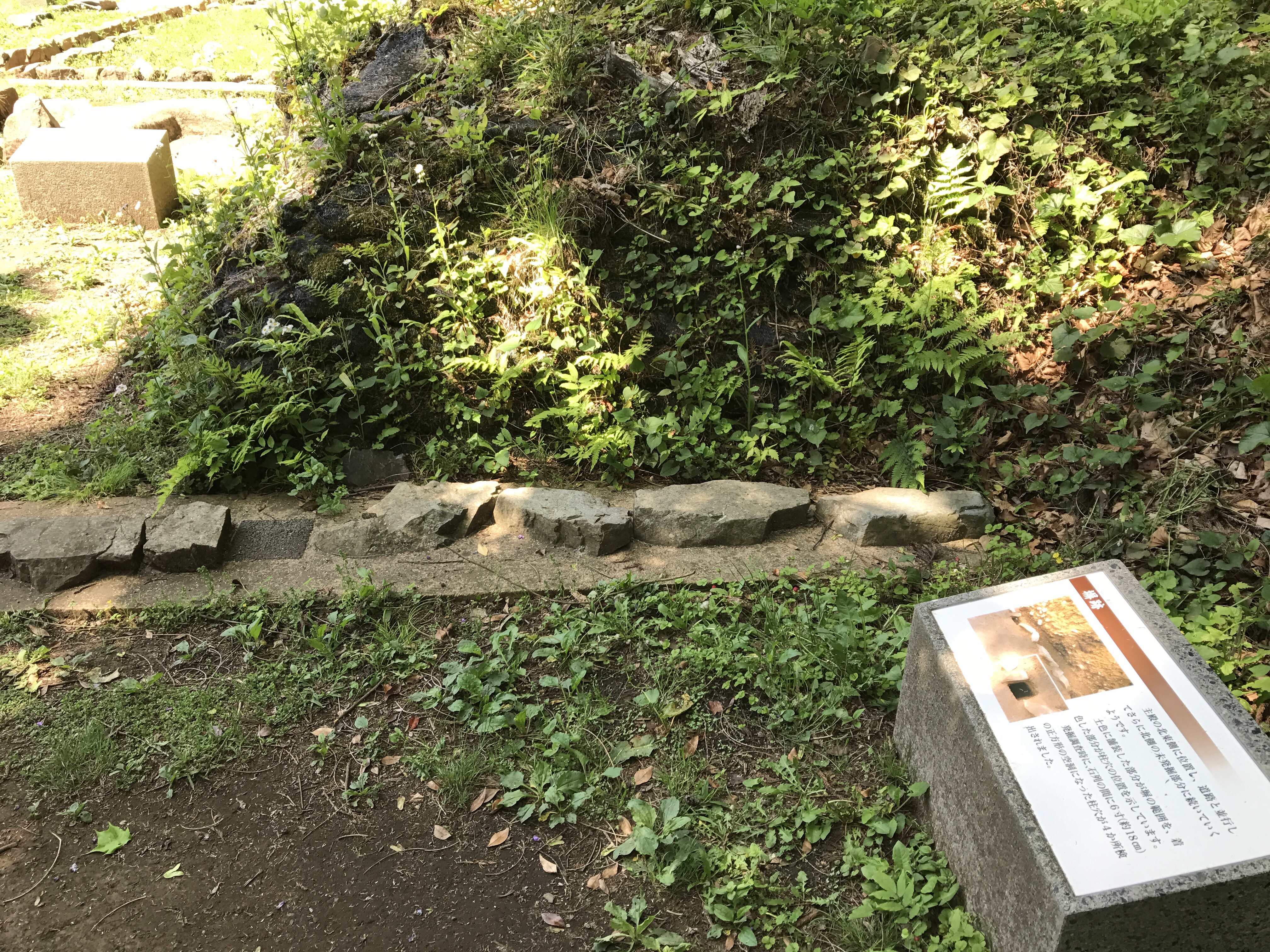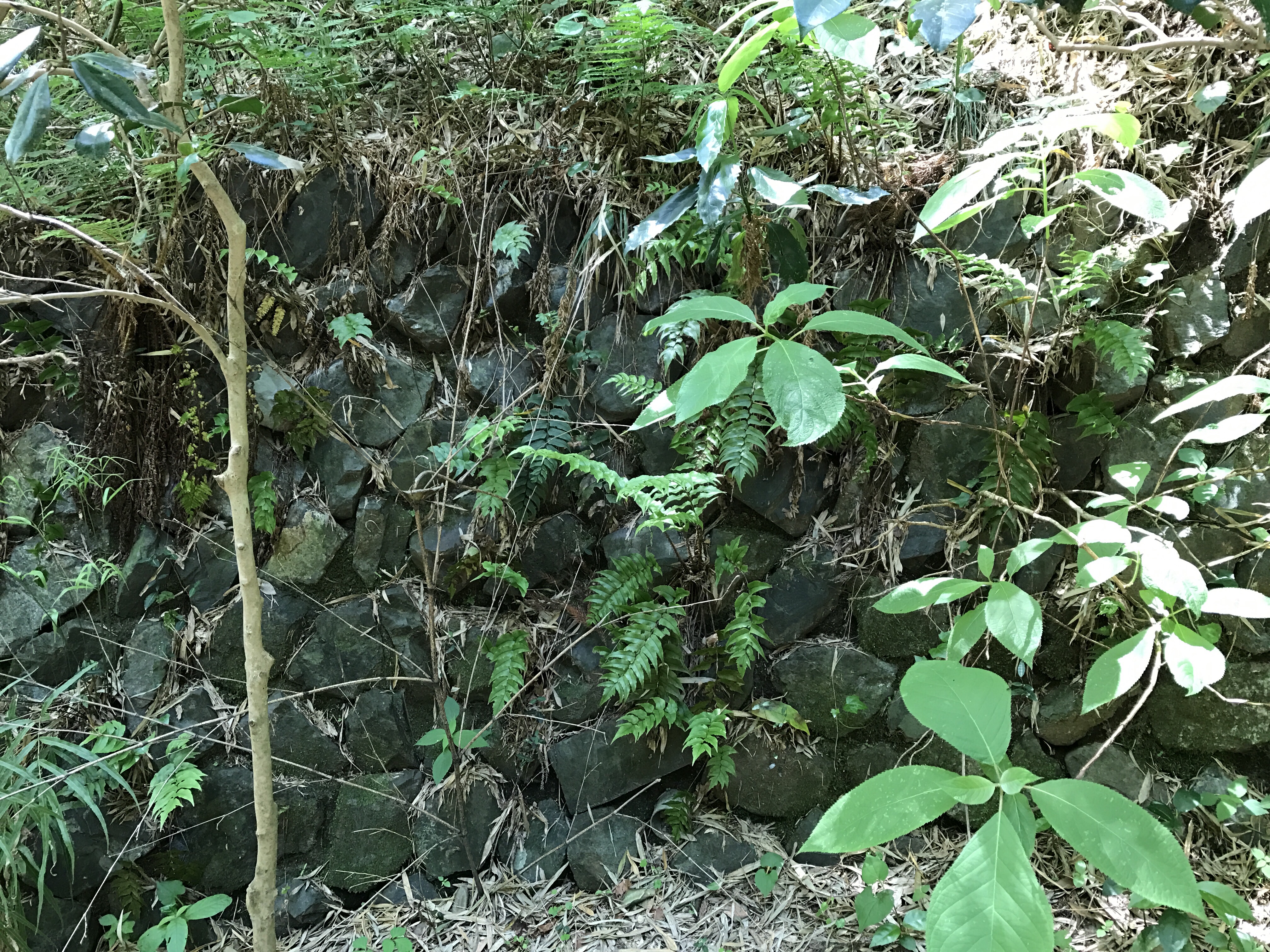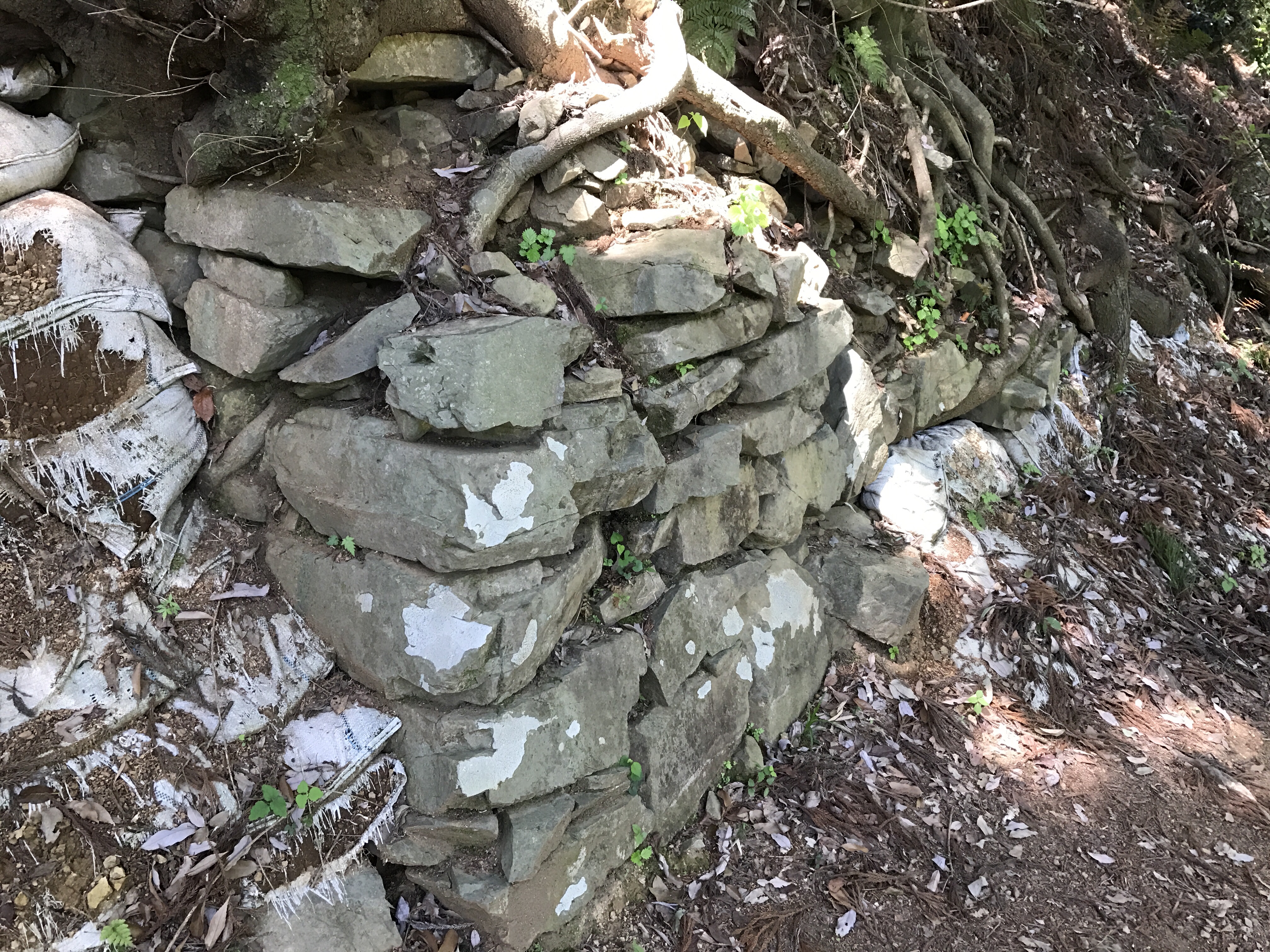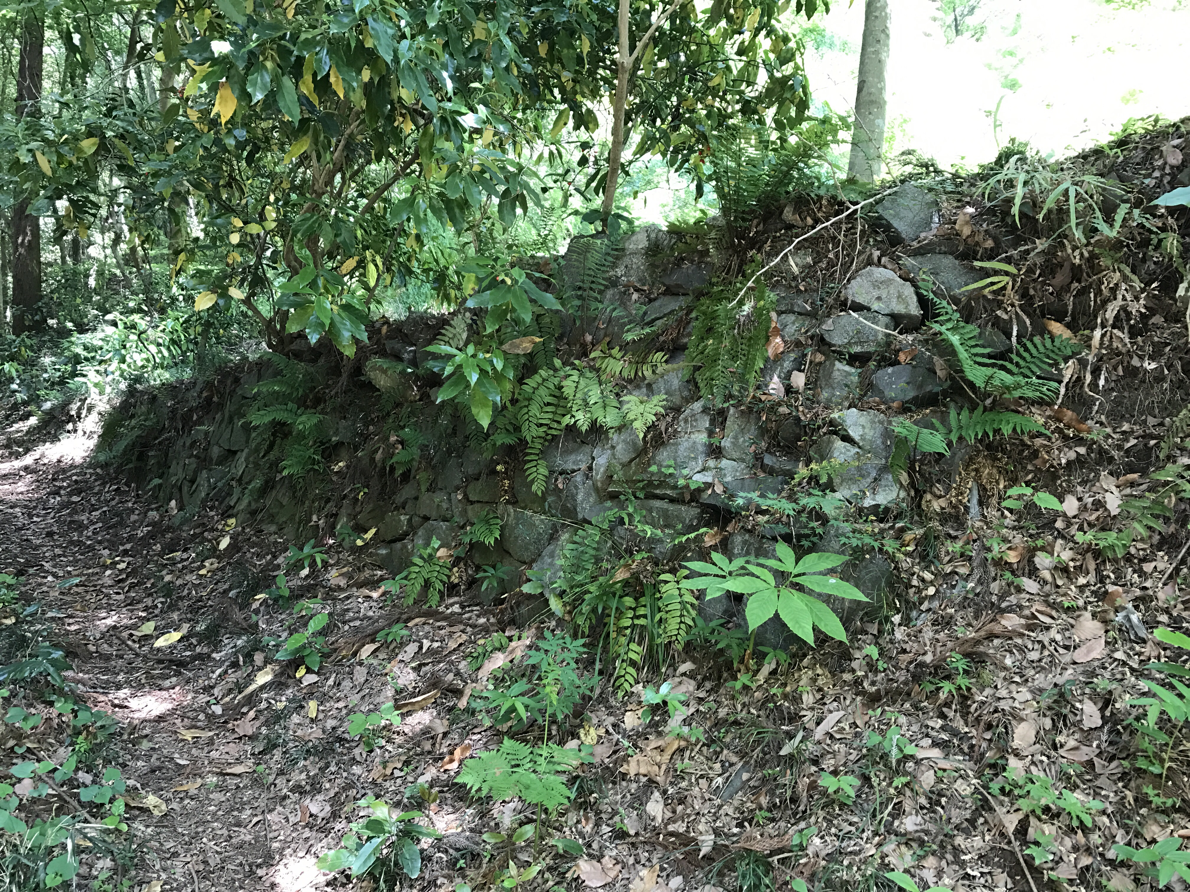 いざ本丸へ。てか、登山(笑)いきなり古びた石垣。当時の物だろうか。