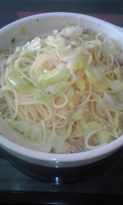 本日のランチ。パスタ屋トラ。ツナ缶とキャベツとニンニクで。旨いぞ~!