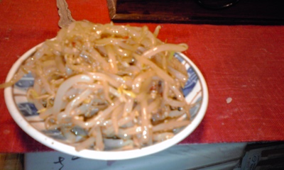 もやしのナムル。酒のつまみに良いぞ。王道、ごま油にゴマにニンニクとしょう油とトウバンジャンと一味で。まぜまぜするだけ。