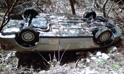 こぇえよ!張り紙を見ると、届け出は出してるそうです。もう、オブジェです。持ち主、ヘコんだだろうなぁ。