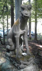 右の狛犬。痩せすぎ!誰か、エサあげてやってくれ。