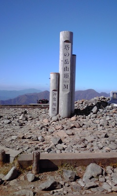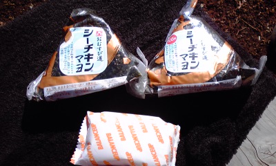 初日。昼飯。二日目に帰りのバスまでに時間ありそうなので、ベーコンとキャベツで塩ラーメンはお預け。コンビニのおにぎりと行動食。てか、朝あわててコンビニ行って、間違って同じ種類のツナマヨを取ってしまってた事に頂上で気づくお茶目なトラ。
