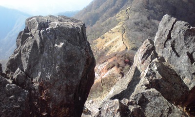 小屋主さんにもお話を聞いたのですが、ここからがかなり過酷でした。マジで恐かったです。急な道の上に両方が絶壁で、幅50センチぐらいの所もあるし。おまけに西丹沢へ行くのはおいら一人で。本日晴れてはいるものの風が強く。神経使いまくりでした。
