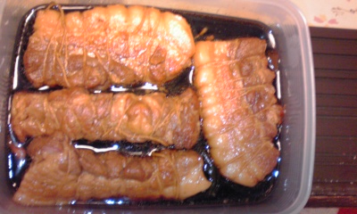 激ウマです。激柔らか。上記は漬け汁です。しょう油と酒とねぎの青い所としょうがとニンニク。煮立ててから漬けます。