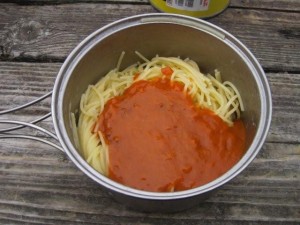 超速く着いてしまったが昼飯。レトルトのミートソース。