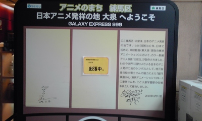 大泉学園駅には999の車掌さんの等身大が守り神の如く置かれているのですが。昨日は出張中だそうです。メーテルとまた宇宙へと飛び立ってしまったのでしょうか。