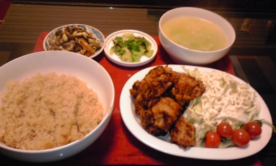 COOKING ちゃ~じ。@「語感でアイロニー」#1027 Posted on 2013/02/28 by kotaro / 0件のコメント 定食屋とら。 唐揚げ定食なり。ショウガの炊き込みご飯。セロリの浅漬け。ひじきと大豆の煮物。キャベツの中華スープ。 栄養チャージ。よし。明日も頑張るべ。 kotaro kotaro の投稿をすべて表示